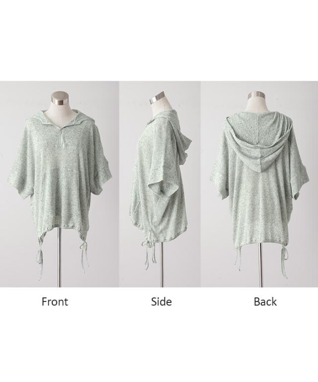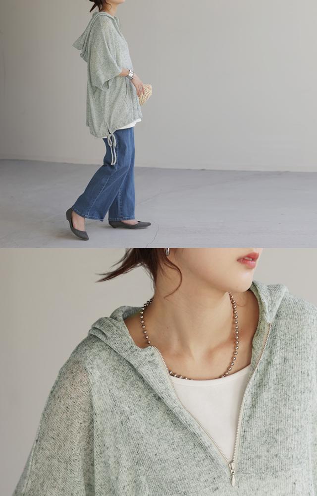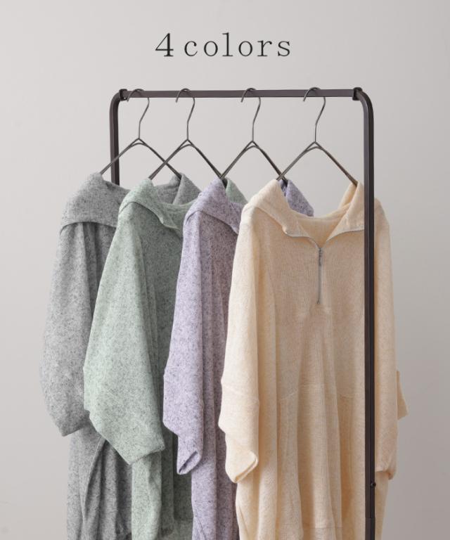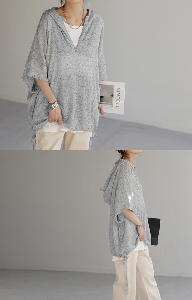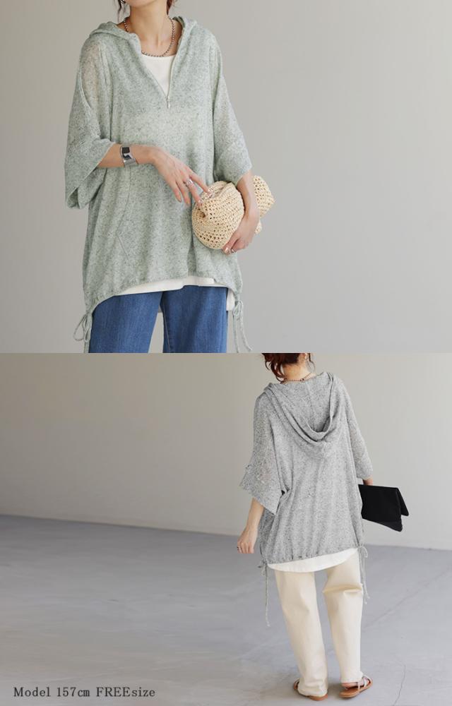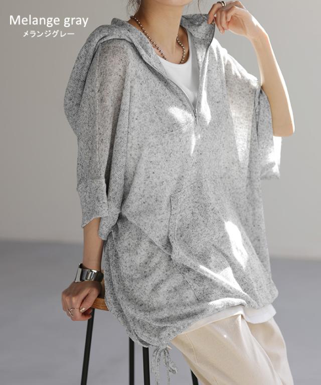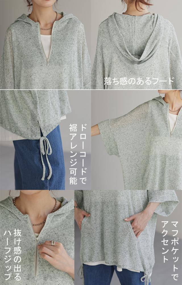 パーカー サマーニット 七分袖 ハーフジップ レディース アウター ライトアウター トップス フーディー ロング 二の腕カバー ビッグ ドルマン ドルマンスリーブ 半袖 羽織 体型カバー レイヤード ゆる お尻が隠れる 無地 グリーン グレー 春 夏 HUG.U 秋新作