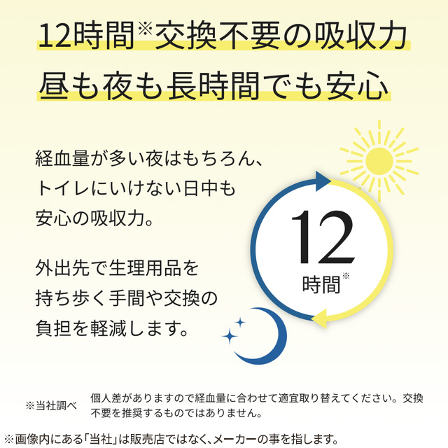 ※2 メーカー調べ。個人差がありますので経血量に合わせて適宜取り替えてください。交換不要を推奨するものではありません。