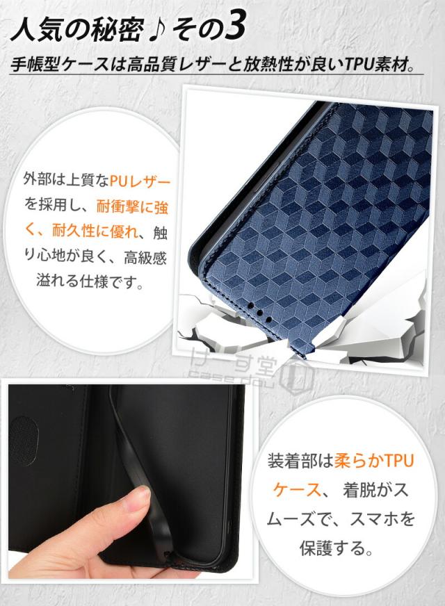 手帳型ケースは高品質レザーと放熱性が良いTPU素材。