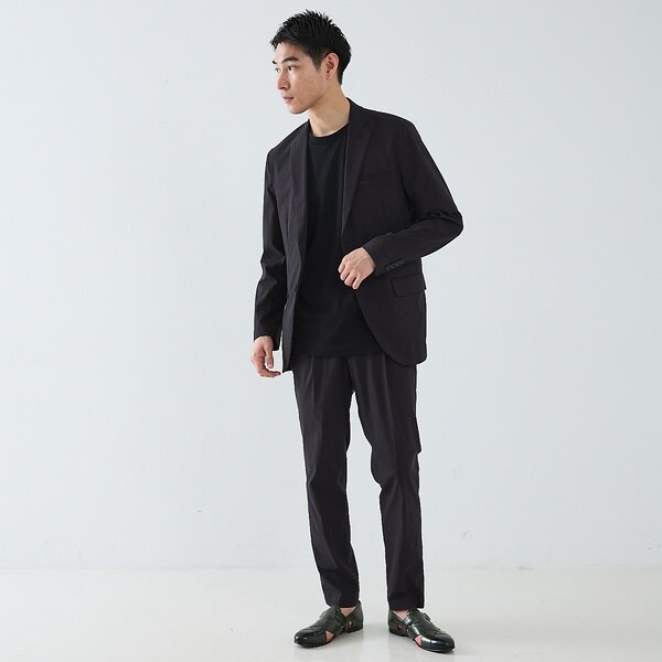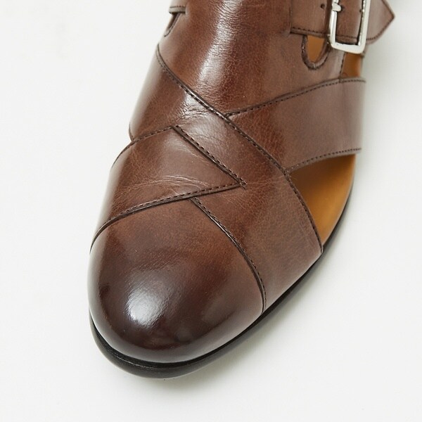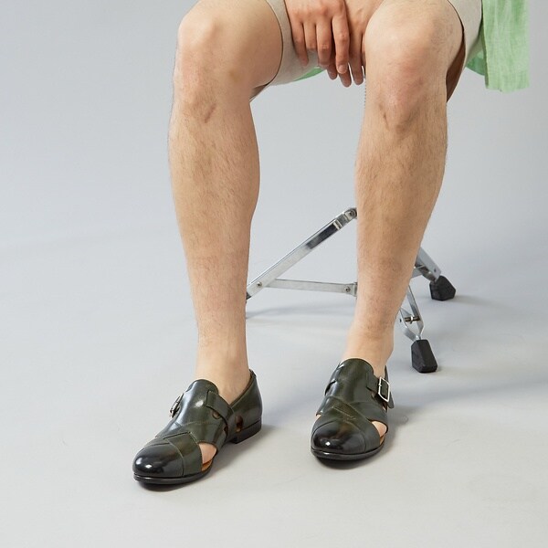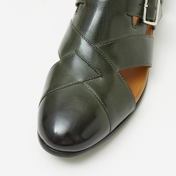 サンダルというカジュアルなアイテムながら光沢のあるレザーとスリムなデザインはキレイ目スタイルに合わせやすい一足。