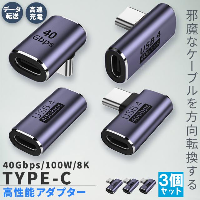 USB4.0 Type C アダプター 4種類 3個セット ストレート L字 L型 延長 接続 オス メス USB-C PD 100W/5A 急速充電 40Gbps高速データ転送 8K@60Hz映像出力 タイプc type-c 90度 USB C コネクター スリム 軽量
