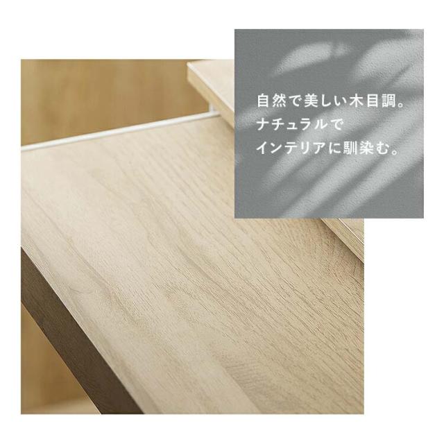 ●機能的で抜け感のあるデザイン:上品で優しいカラーリング。抜け感のある細めのスチール脚もポイント。収納・機能性も充実。自然で美しい木目調があたたかな雰囲気を演出。