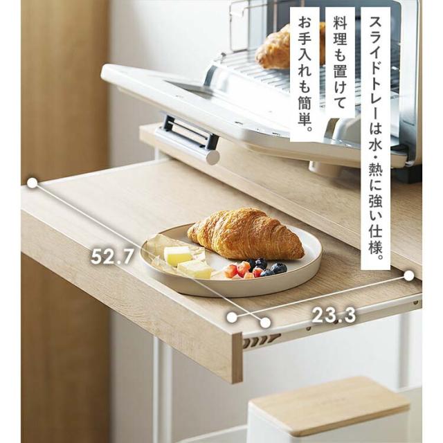 ●オープン収納/スライドトレー:仕切りがなく、フラットに使えるオープン収納。スライドトレーは料理も置けてお手入れも簡単。便利な2口コンセント付き。