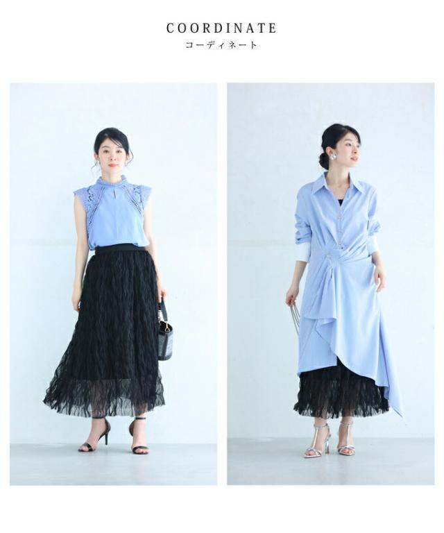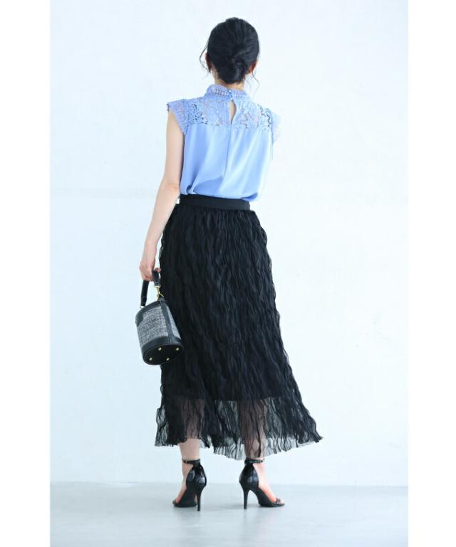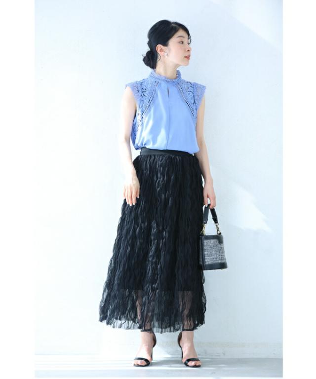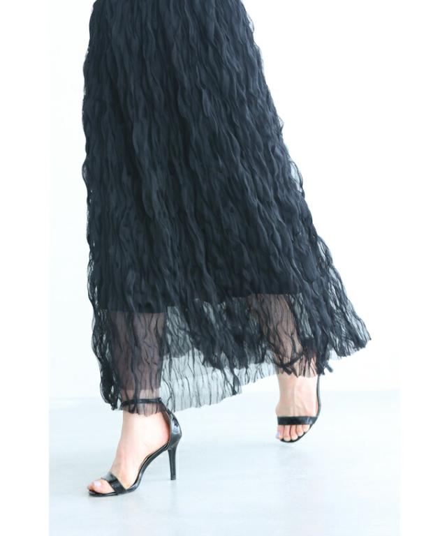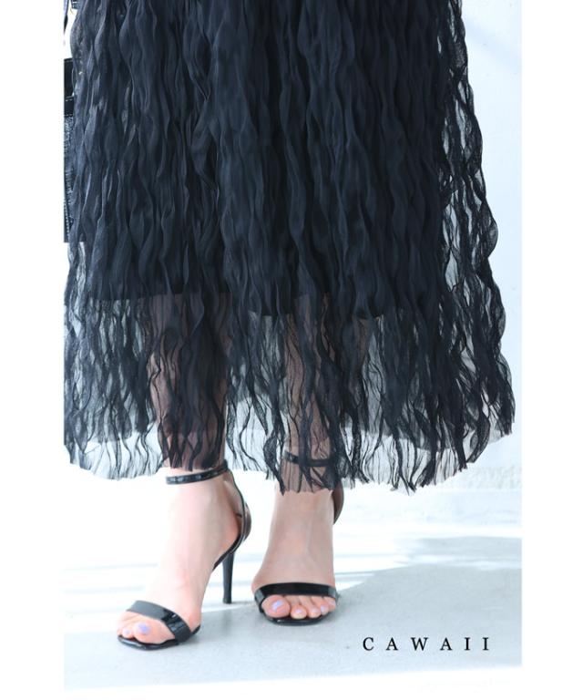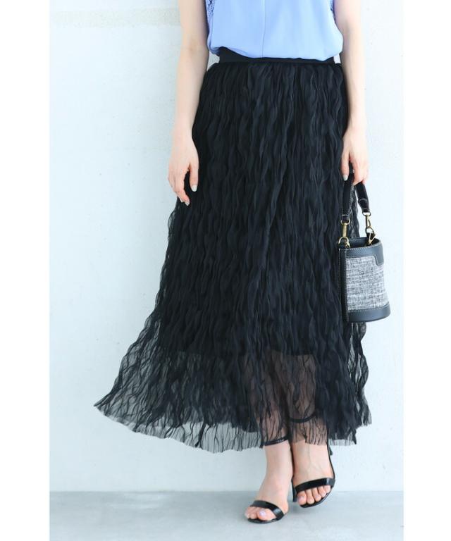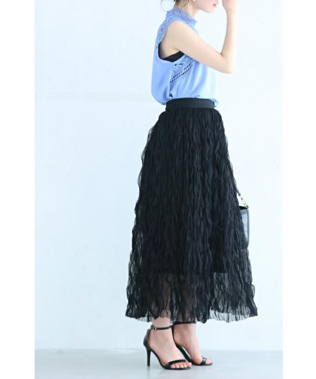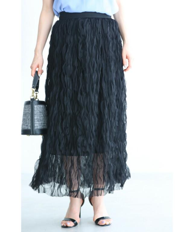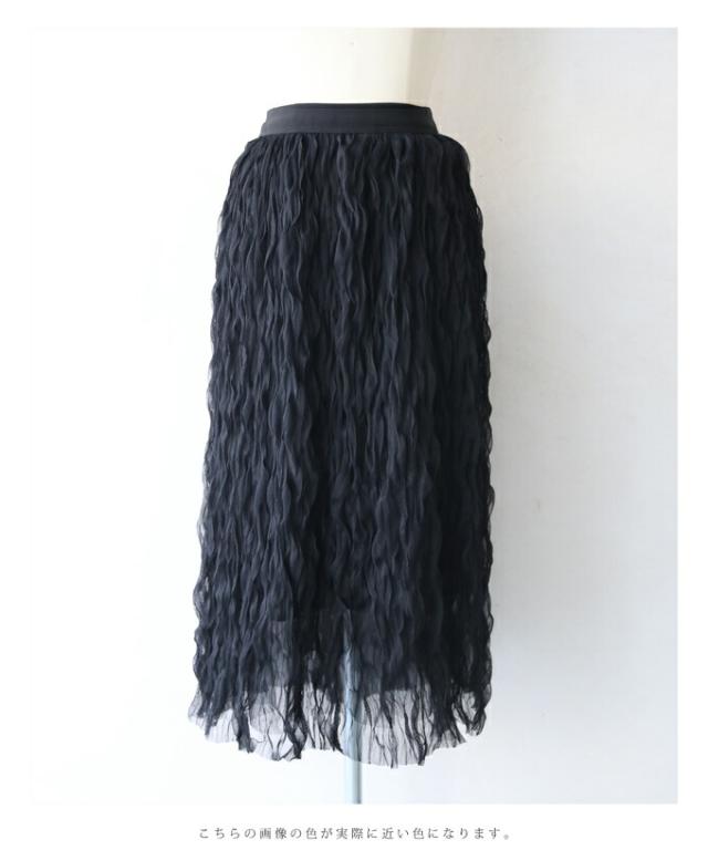 w50349nc 新作 新着 再入荷 CAWAII FRENCHPAVE フレンチパヴェ エレガント ベーシック カジュアル 可愛い かわいい カワイイ おしゃれ オシャレ お洒落 個性 個性的 定番 ベーシック 大人かわいい 大人可愛い 上品 女性らしい デザイン スタンダード ナチュラル きれいめ キレイめ シンプル フェミニン レディース レディースファッション 大人 ママ ミセス 30代 40代 50代 60代 黒 波うつ ゆらゆら チュール ミディアム スカート ウエストゴム ゴム 総ゴム S M L 2L LL XL フリーサイズ フリー 小さめ 小さめサイズ小さい 小さいサイズ 低身長 痩せ ほっそり 小柄 細身 標準サイズ 大きめシルエット 大きい 大きめ ビッグシルエット ぽっちゃり F サイズ自由 春服 春物 夏 夏服 夏物 秋服 秋物 ブラック 黒 黒色 無地 ワンカラー ワントーン 着回し 重ね着 レイヤード ふんわり 日常着 普段着 日常使い おでかけ 休日 旅行 家族旅行 女子会 同窓会