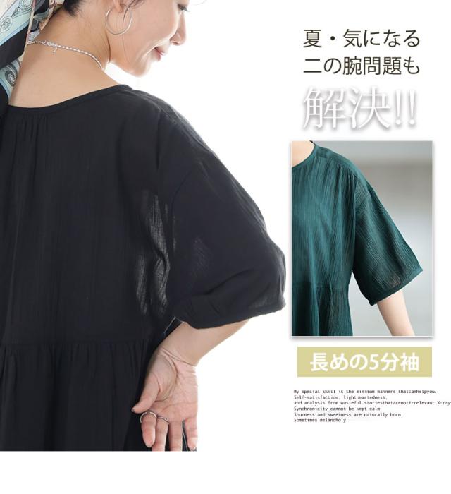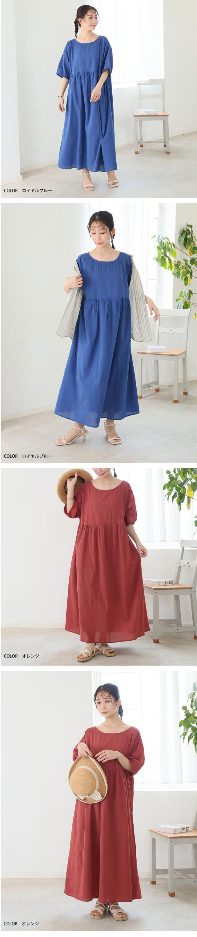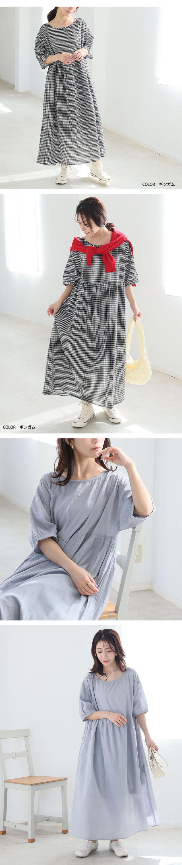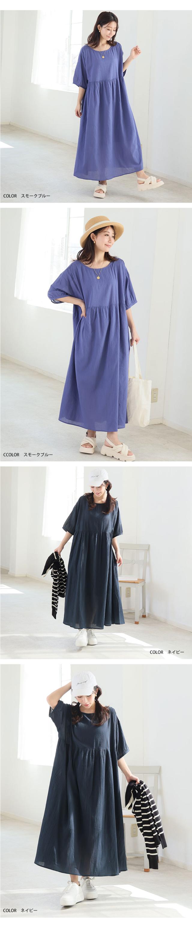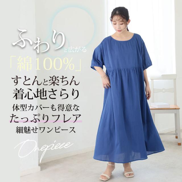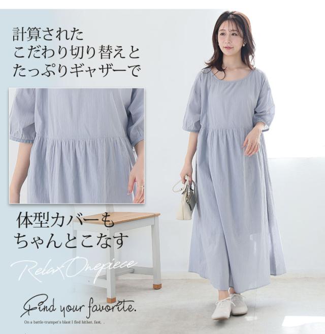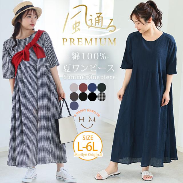 新作 大きいサイズ レディース ワンピース | 【風通るプレミアム】 綿 楊柳 五分袖 ウエスト切替 ワンピース [496025] LL 3L 4L 5L 6L