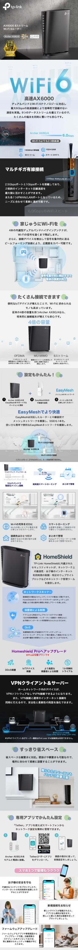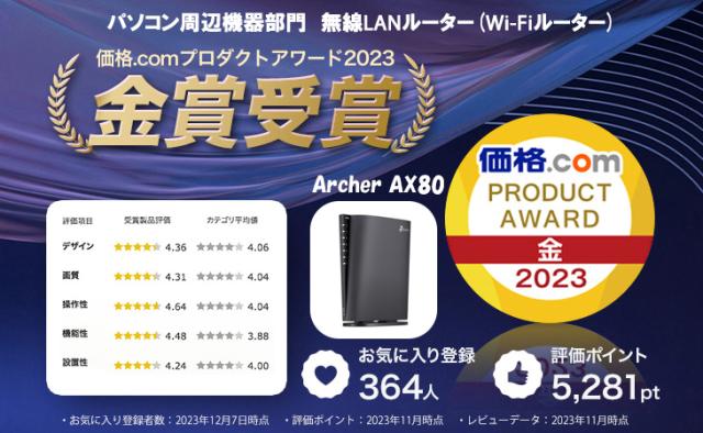 WiFi6ルーター 超高速 AX6000 2.5GbEポート搭載 Archer AX80/A 無線LANルーターUSB3.0 EasyMesh対応【2023家電批評上半期BEST BUY】