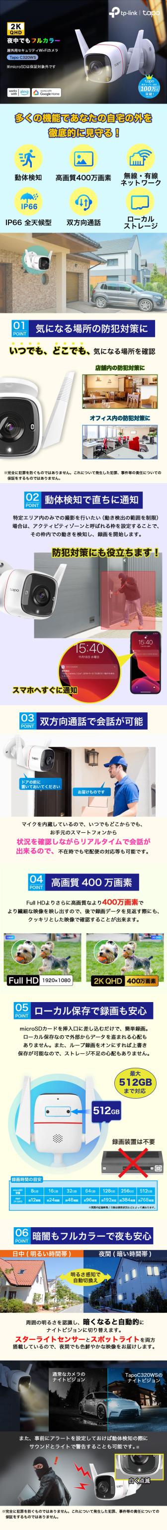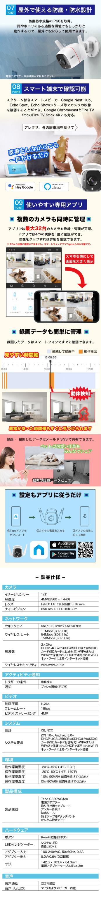 [特徴] 2K QHD高画質屋外用カメラ Tapo C320WS。ライトがついて夜間でもフルカラー撮影。