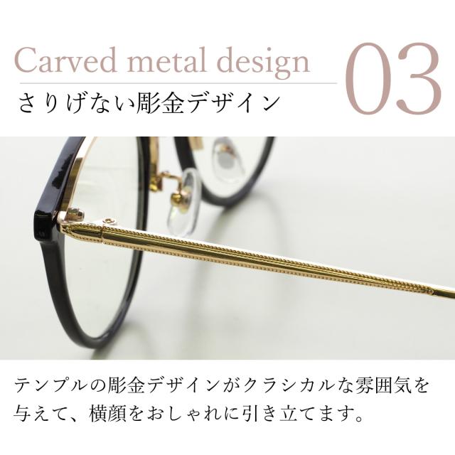 テンプルのメタル素材には彫金デザインを施し、横顔を美しく引き立てます。