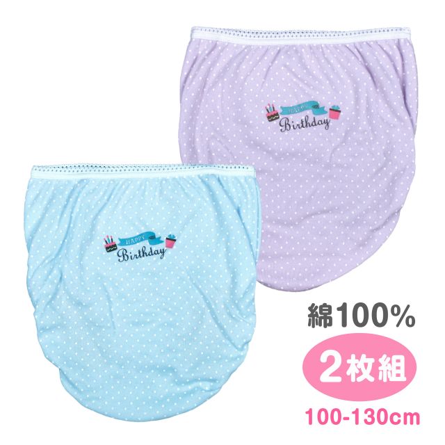 お肌に優しいコットン100% 同柄色違いの 2枚セット のショーツです。ウエストはアウトゴムタイプ。足口はインゴムタイプ。バースデーケーキのプリントが可愛いショーツです。2枚セットなので洗い替えに最適です。