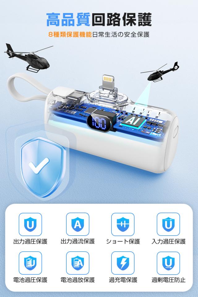 高性能ICチップと安全装置が内蔵されており、モバイルバッテリーが過充電・過放電・過熱・ショートの際に、自動的に充電を停止してくれますので、安心して使うことができます。