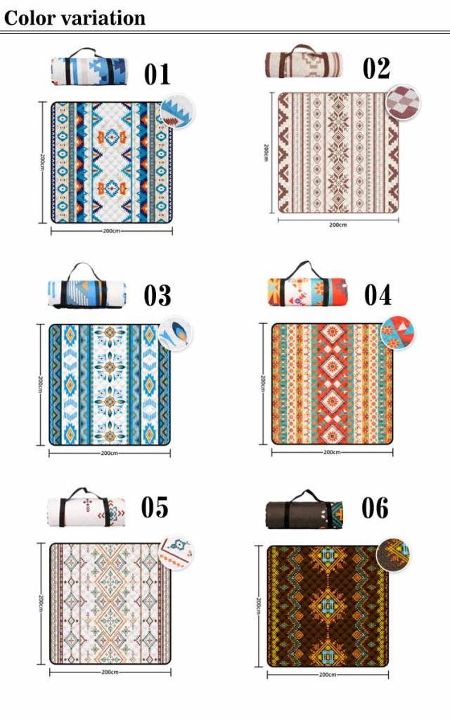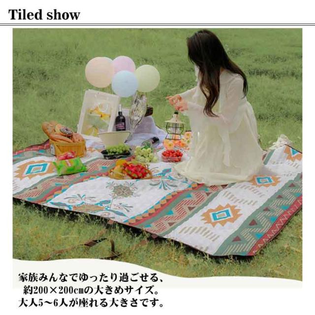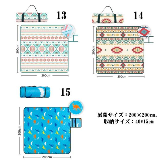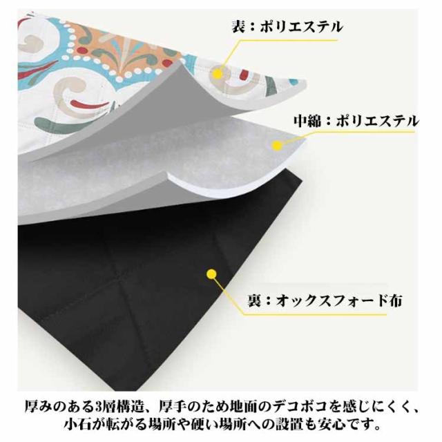 | 【200×200cm】【厚みのある3層構造】【北欧風全15柄】 家族みんなでゆったり過ごせる、約200×200cmの大きめサイズ。大人5〜6人が座れる大きさです。 テント内のインナーマットとして、折りたたんでコットやアウトドアベッドのクッションとしてのご使用もおすすめです。 厚みのある3層構造、厚手のため地面のデコボコを感じにくく、小石が転がる場所や硬い場所への設置も安心です。 表生地・裏生地ともに撥水性があるので汚れに強く、飲みこぼしもサッと拭き取れます。また、汚れが気になるときは、ご家庭の洗濯機で簡単に洗えるため衛生的です。 使わない時は、クルット畳んでコンパクトに☆持ち運びにも便利! キャンプやピクニックはもちろん、運動会やフェス・屋外ライブでのご使用もおすすめ。また、お部屋のインテリアにマッチするデザインなので、お家でラグのように使用することもできます。 表:ポリエステル 裏:オックスフォード布 中綿:ポリエステル | |