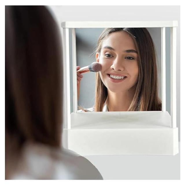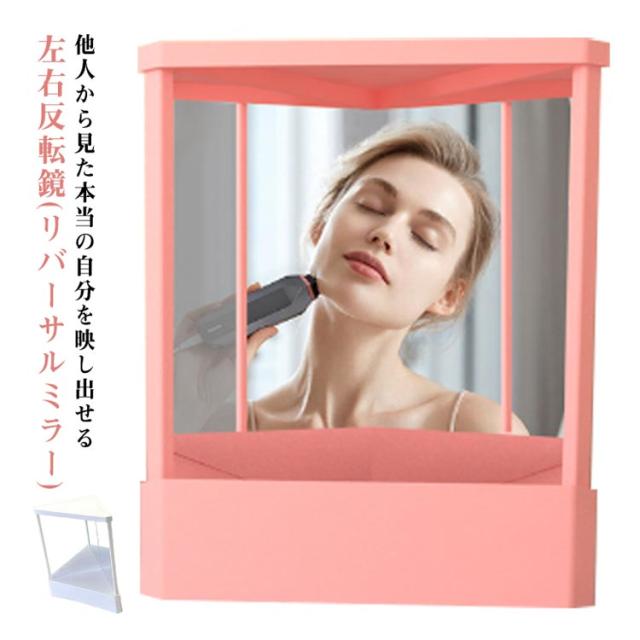 | 他人から見た本当の自分を映し出せる左右反転鏡(リバーサルミラー)。 リバーサルミラーは、90度の角度で合わさった2枚の鏡で出来ています。鏡に自分の姿を映すと、本来”他人から見られている自分”が映し出されます。 顔の歪み、たるみを知ってメイクをさらに上達させます。 | |