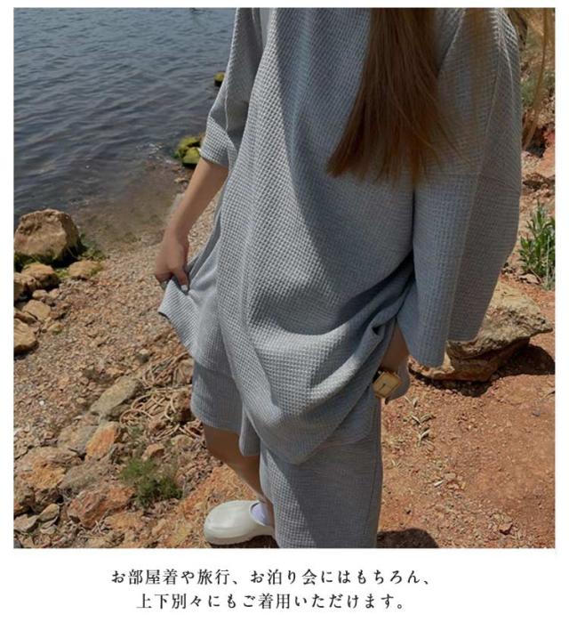 | 夏にピッタリなショートパンツと半袖トップスの上下2点セットです。 ウエストゴムで穿きやすい、ゆったりとしたサイズ感です。 お部屋着や旅行、お泊り会にはもちろん、上下別々にもご着用いただけます。 クリーンな印象なのにリラックス感のある生地で、大人にぴったり。 | |