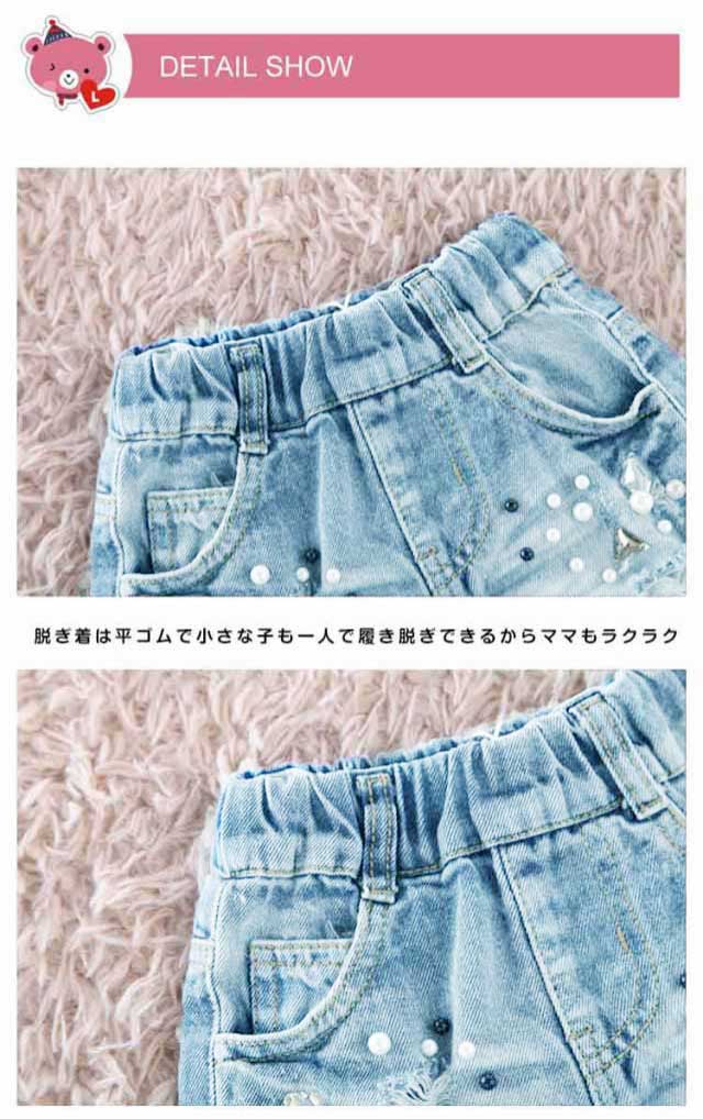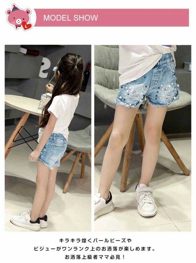 お洒落上級者に! デニムパンツ デニムショートパンツ ショートパンツ ビジュー付き パールビーズ 女の子 キッズ ジュニア ダメージ加工 クラッシュ加工 ウォッシュ加工 ハーフパンツ デニム ジーンズ お洒落 ファッション