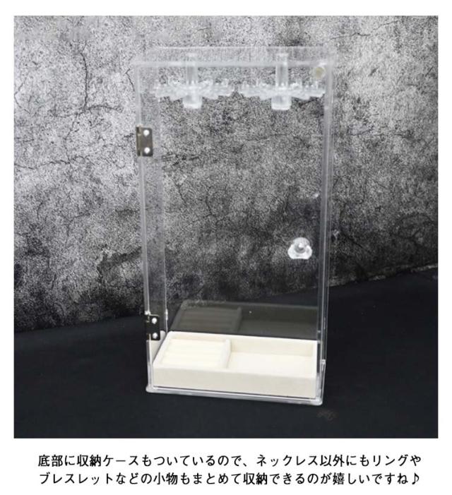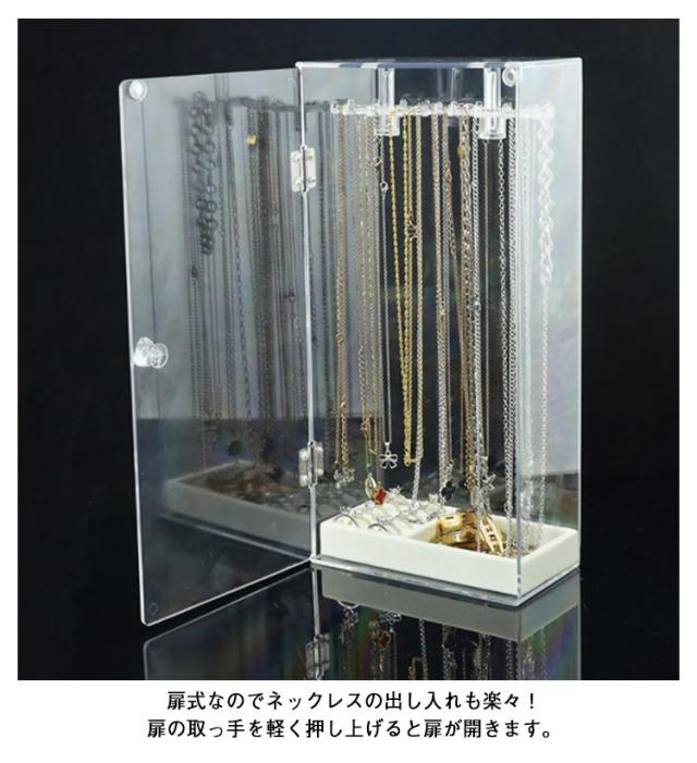 | お気に入りのジュエリーを、飾って、見せて、便利に収納! 扉式なのでネックレスの出し入れも楽々!扉の取っ手を軽く押し上げると扉が開きます。 フックは回転するので、奥に吊るしたものも取り出しやすくなってます! 底部に収納ケースもついているので、ネックレス以外にもリングやブレスレットなどの小物もまとめて収納できるのが嬉しいですね♪ 24本のフック付き!最大72本ネックレスがかけられます。 透明度が高く、シンプルなデザインなのでネックレスを入れて飾っておくだけで お部屋のインテリアにも! | |