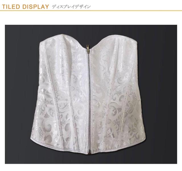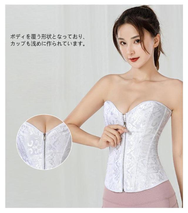 | ウエストを細く固定し、バストも大きく見せる、美しいシルエットになります! ボディを覆う形状となっており、カップも浅めに作られています。 伸縮性のある素材を使用し、体フィットし動きやすい着用感です。 ファスナー付きの前開き式なので、着脱しやすい。 背面にはストラップデザインを採用し、締め具合を調整可能です。 ブライダルインナーとしてぴったり!背中の開いたドレスでも安心です。 | |