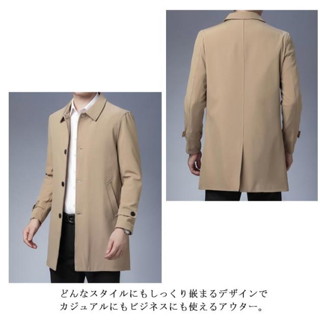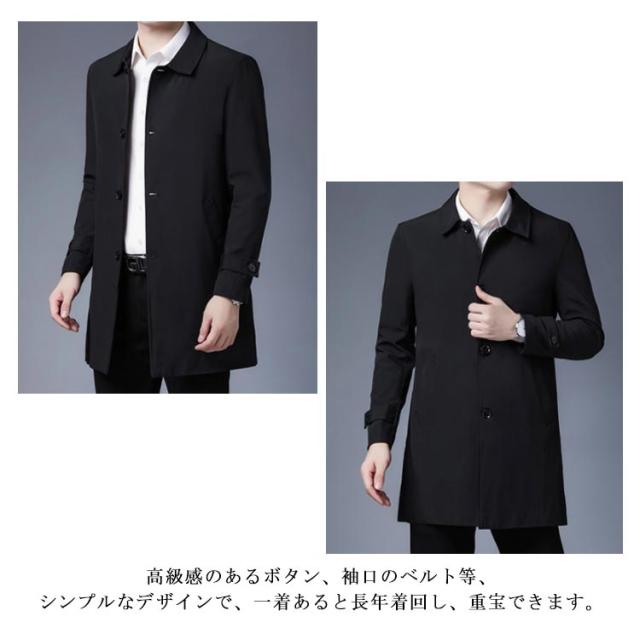 | 上質で大人雰囲気漂う春秋定番メンズコート。 すらりとしたスリムなシルエットでスタイルをよく見せてくれる効果があります。 耐久性に優れるポリエステル素材でシワがなりにくく、型も崩れにくい、ロングシーン愛用いただけます。 高級感のあるボタン、袖口のベルト等、シンプルなデザインで、一着あると長年着回し、重宝できます。 どんなスタイルにもしっくり嵌まるデザインでカジュアルにもビジネスにも使えるアウター。 | |