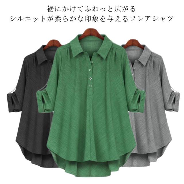 春 フレアシャツ チュニック フレア レディース 秋 チュニック プルオーバー ロングシャツ シャツブラウス 長袖 ナチュラル 襟付き トップス ドロップショルダー 体型カバー ゆったり 大きいサイズ ロング丈 フレアシャツ 無地 ボタン付き 30代 40代