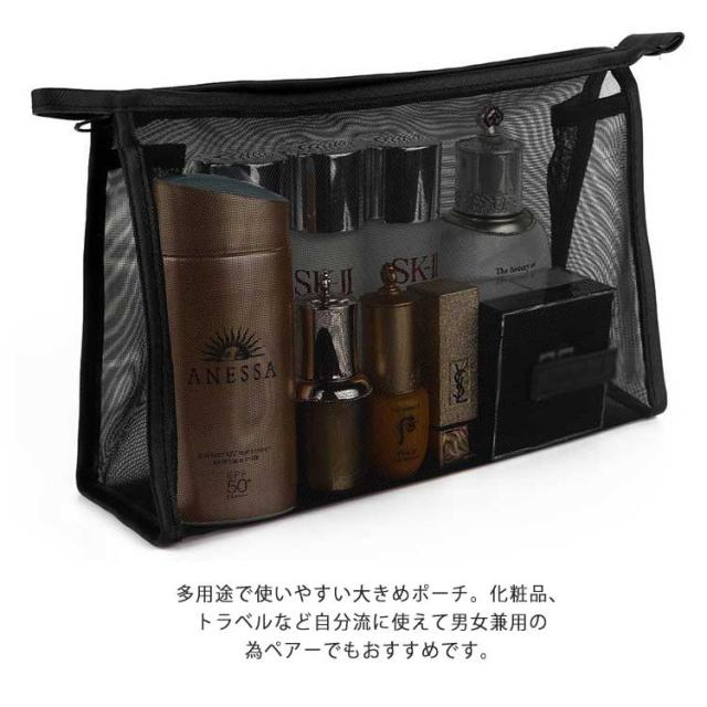 | 中身が分かるメッシュ素材 小さく折りたためるトラベルポーチにも便利 シンプルなデザインが持ちやすいポーチです。 多用途で使いやすい大きめポーチ。化粧品、トラベルなど自分流に使えて男女兼用の為ペアーでもおすすめです。 | |