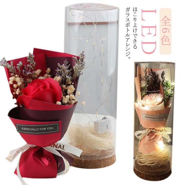 | ほこりよけできるガラスボトルアレンジ。 クリアカバー付きでずっとキレイに飾ることができます。お花が汚れない。 コンパクトなサイズ感、玄関やデスクの上に飾っても可愛いソープフラワー。 キラキラLEDライト付きでロマンチックな雰囲気が一瞬に作れます。 透明窓付きの専用手提げ袋が付属ですぐにお渡しできます。 | |