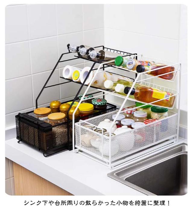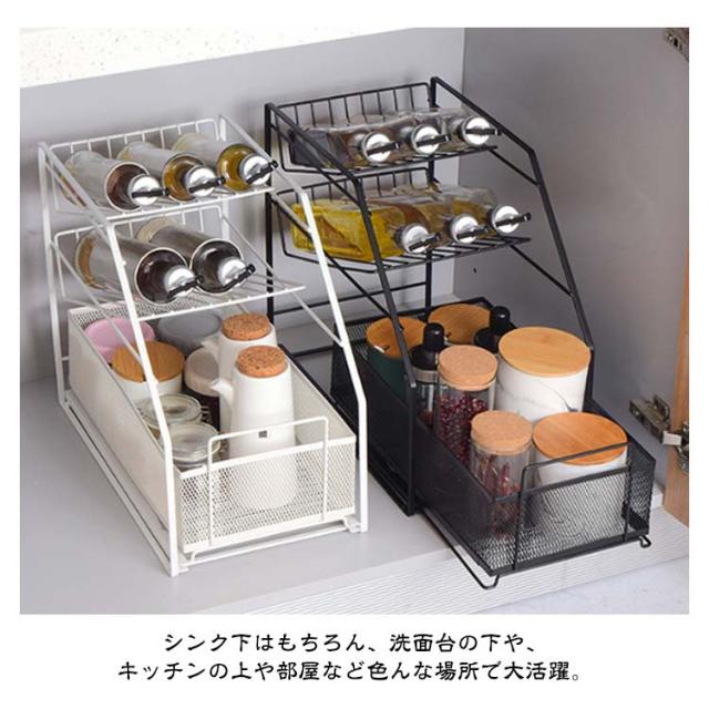 | 【シンク下収納】【引き出し式】【3段/2段】 シンク下や台所周りの散らかった小物を綺麗に整理! スライド式なので、出し入れが簡単で中身が見やすく、整理がしやすくなってます シンク下はもちろん、洗面台の下や、キッチンの上や部屋など色んな場所で大活躍。 スペースを活用してキッチン小物を整理整頓できます。 シンクの下を使いやすく、無駄なく収納できます。 | |