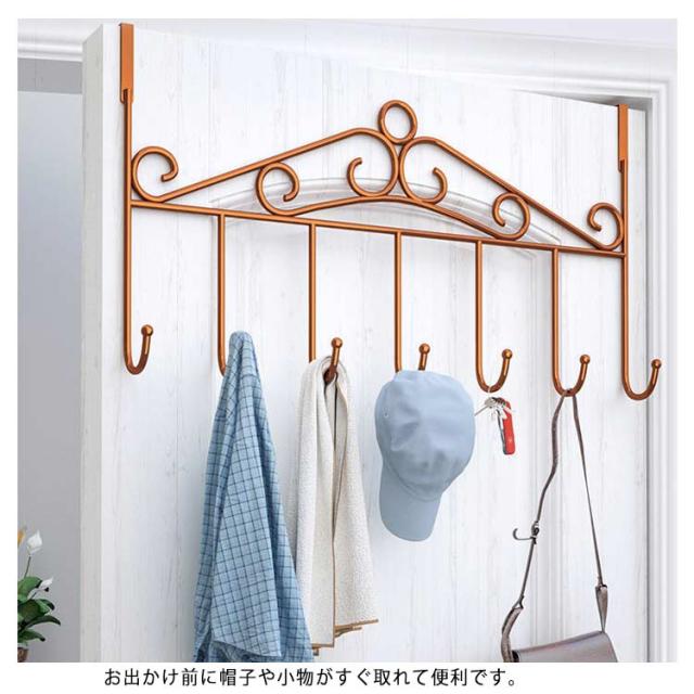 | 7連ドアハンガーでたっぷり収納。 ドアが収納スペースに生まれ変わります。 帽子やカバン、コートやスカーフなどすっきり整頓!! お出かけ前に帽子や小物がすぐ取れて便利です。 ねじなど必要なく、穴を開けなくてもお部屋のドアに簡単に取り付け可能です。 ※厚さ4.6cm以下のドアに対応しています。 | |