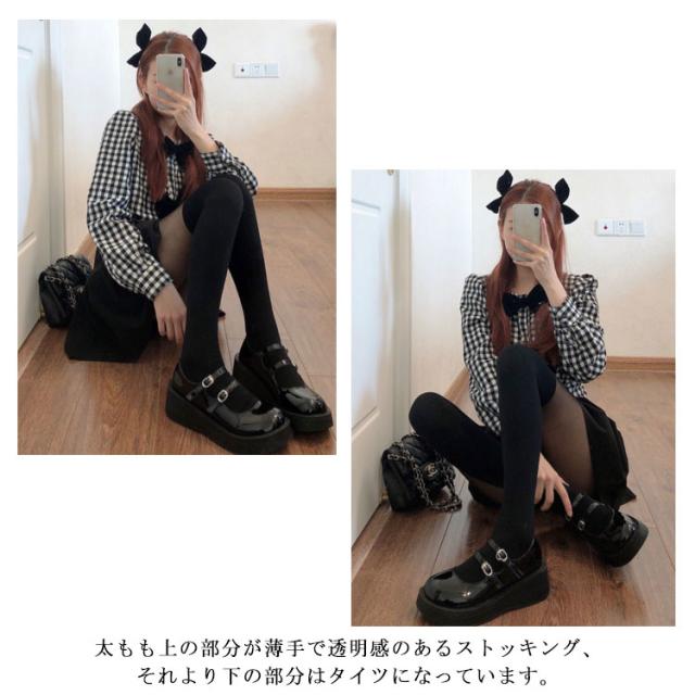 | オーバーニーとの重ね着を演出する透明と非透明の切替がスタイリッシュなタイツ。 太もも上の部分が薄手で透明感のあるストッキング、それより下の部分はタイツになっています。 切替で脚をすっきり見せてくれるのがポイント! フェイクオーバーニーハイで、美脚や脚長効果も期待できます。 | |
