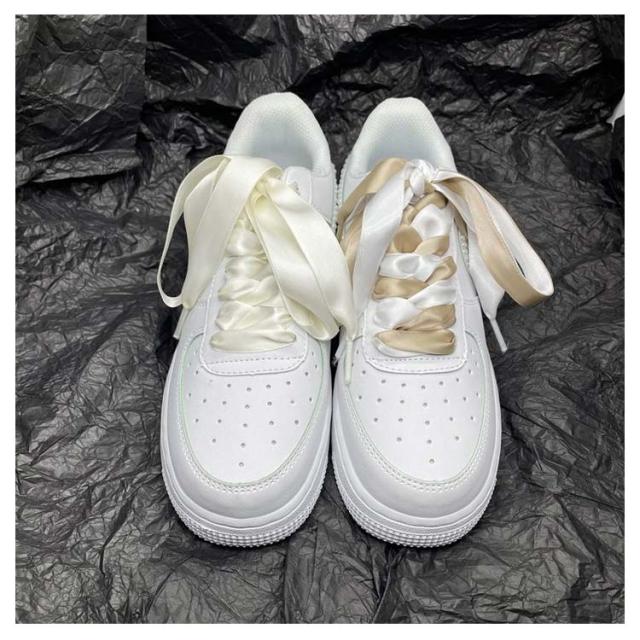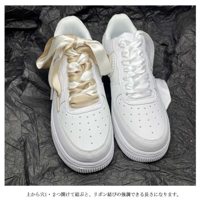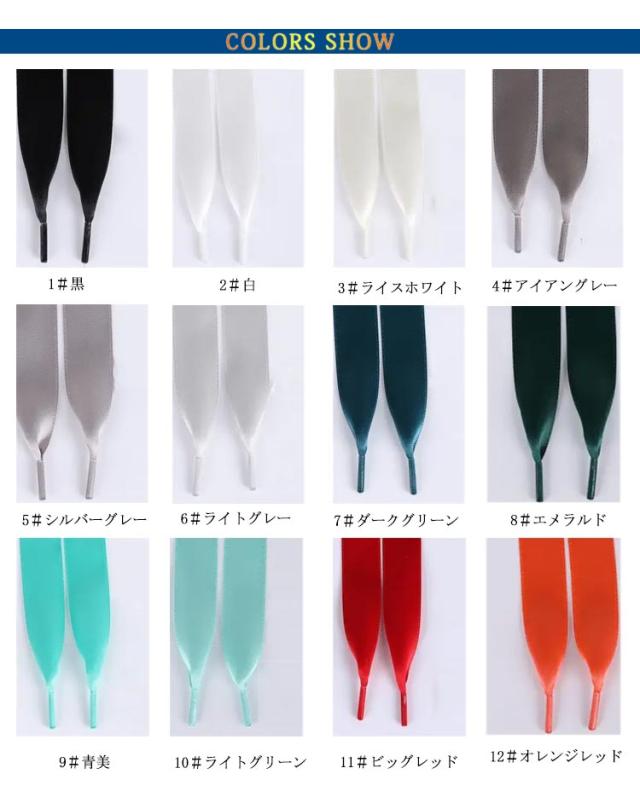 | リボンシューレースです。 靴のイメージを変えたり、ヘタってしまったシューレース(靴ひも)の替えにも♪ 上から穴1・2つ開けて結ぶと、リボン結びの強調できる長さになります。 スタイルや好みによって、色を変えて個性を出してください。 | |