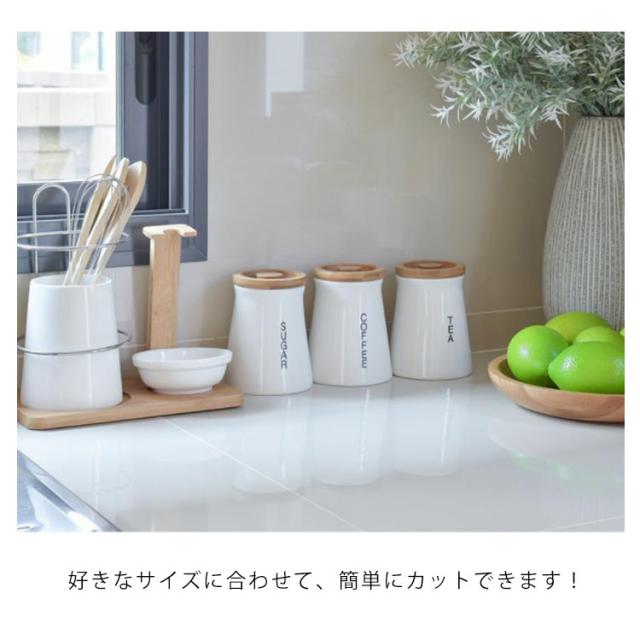 | 防水・防汚・耐熱・抗菌!キッチンシート 水や油に強いので、飛び散ってしまった汚れも、濡れたタオルで拭くだけでキレイになります。 抗菌加工が施されているので、いつでもキッチンを清潔にキープ! ツルツルとした光沢感がある無地タイプだから使う場所を選ばないです。 好きなサイズに合わせて、簡単にカットできます! 台所だけではなく、洗面台や戸棚、トイレまわり、浴室など幅広く使えるので便利です。 | |