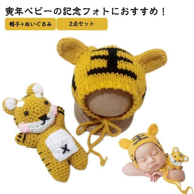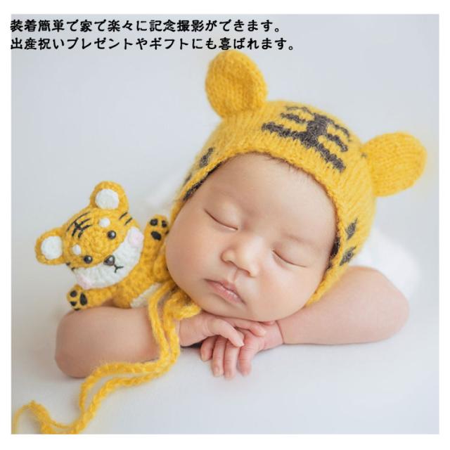 月齢フォト ニューボーン フォト ベビー 虎 寅年 帽子+ぬいぐるみ 2点セット ニット 男の子 女の子 寝相アート イエロー 衣裳 仮装 コスチューム 写真撮影 記念写真 記念撮影 ギフト 出産祝い 年賀状作り