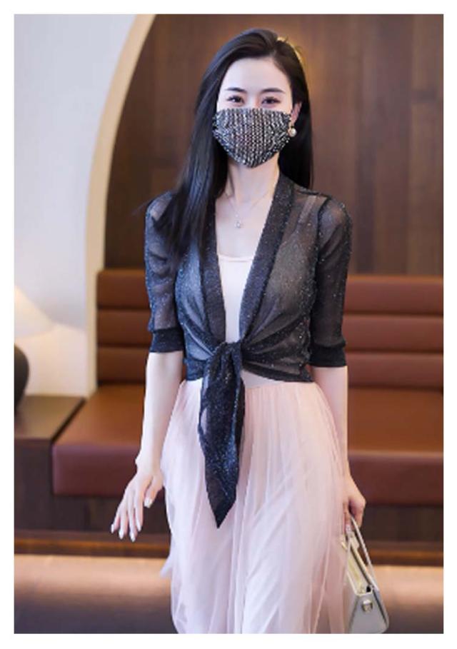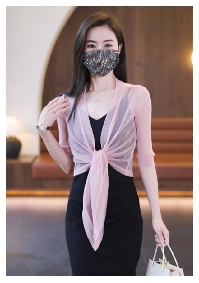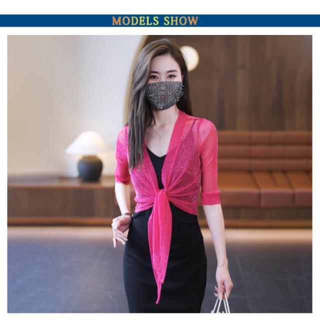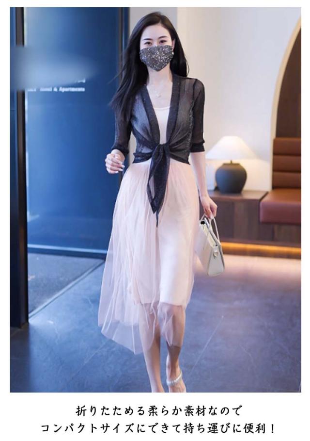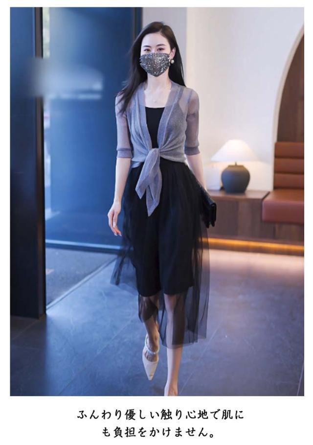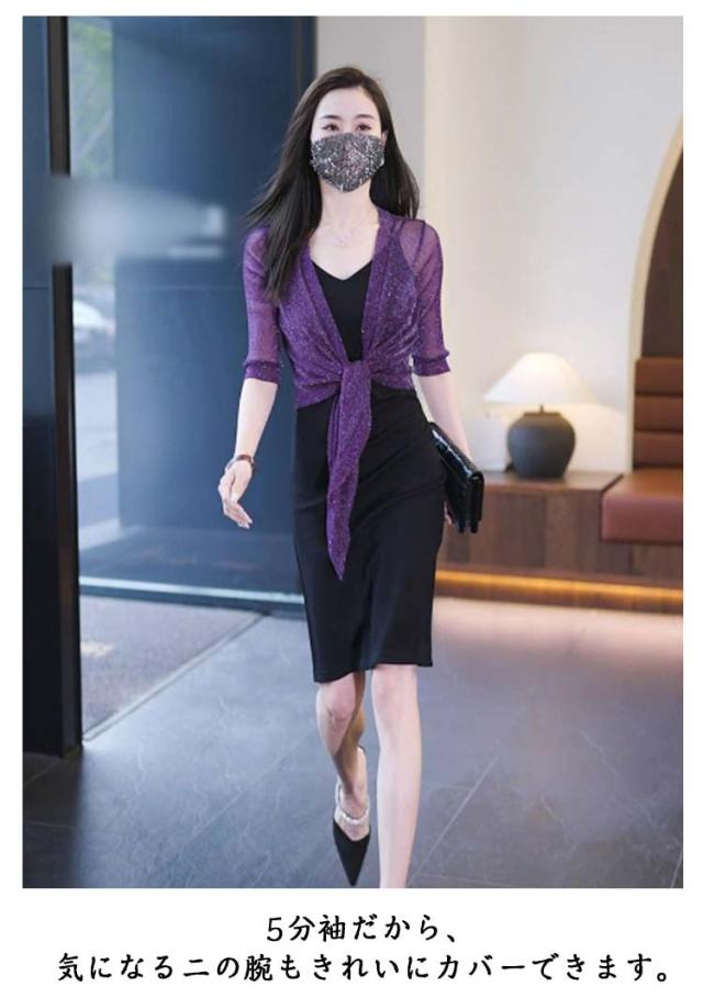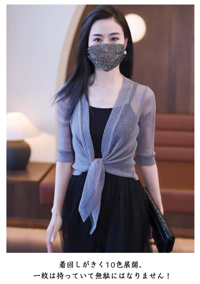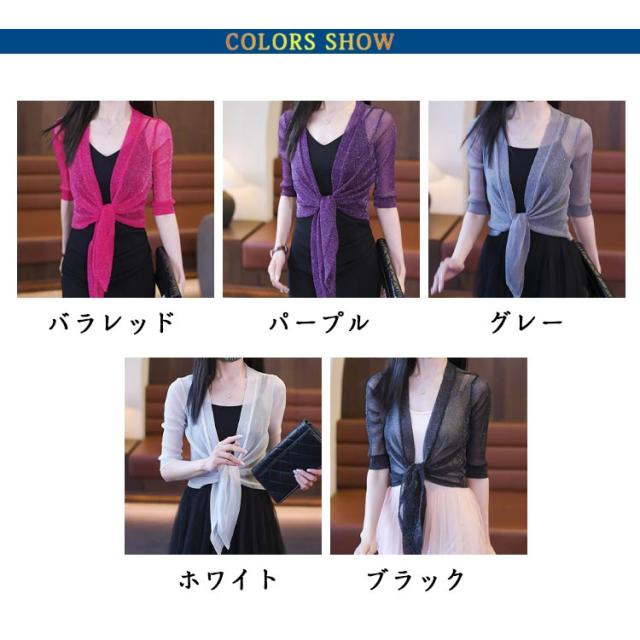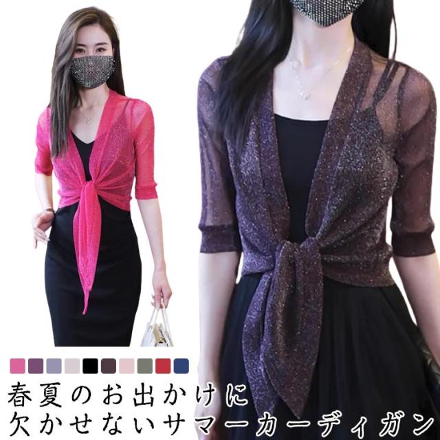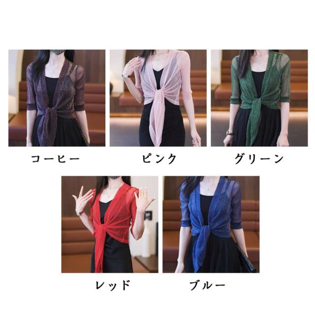 ショート丈 5分袖カーディガン ラメ入り サマーカーディガン レイヤード ボレロ カーディガン 羽織り ボレロ フロント絞り リボン結び きれいめ 透け感 レディース 春夏 女性 旅行 おしゃれ かわいい 体型カバー 大人 シースルー