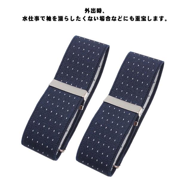 | カジュアルにビジネスに丈の長いシャツの袖を調整するアームバンドです。 サッと腕に通すだけで、お好みの袖丈に簡単調節できるので、スーツ姿もビシッ! 締め付け感が少なく伸びが良い、袖が長いワイシャツに簡単に対応、 素早く袖丈を調整します。 アジャスター付で腕の太さに合わせて細身の方から太目な方までご使用頂けます。 外出時、水仕事で袖を濡らしたくない場合などにも重宝します。 | |