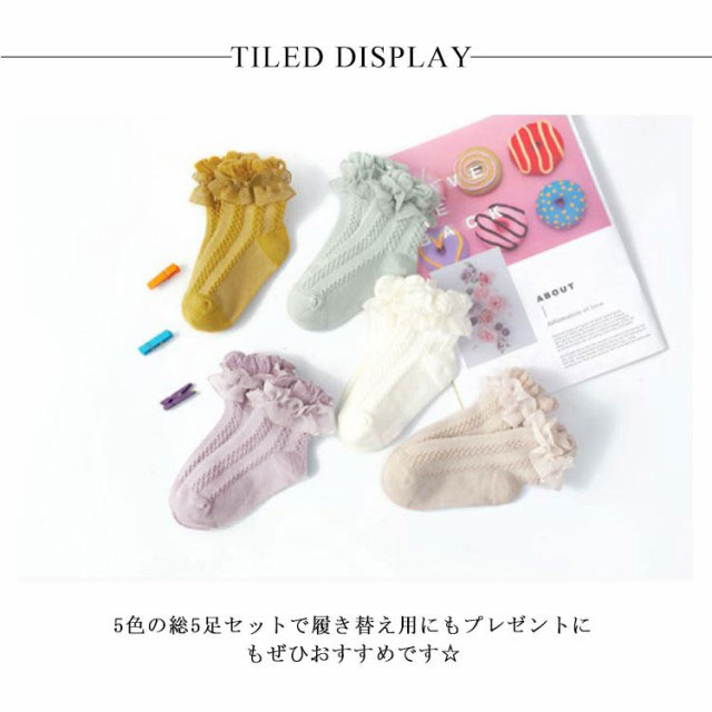 | とびきりガーリーポップに可愛く、フリルアンクルソックス。 5色の総5足セットで履き替え用にもプレゼントにもぜひおすすめです☆ 伸縮性がしっかりあり、お子様自身でも着脱しやすい柔らかさで◎ 履き口も弾性あり、長く過ぎず短く過ぎない、程度良い丈感、締め付けません。 薄すぎず厚すぎず様々なシーズンに対応してくれる快適なフリルソックスです。 普段着はもちろん、お受験、卒業式、卒園式、入園式、七五三、発表会などのフォーマルシーンでに大活躍! | |