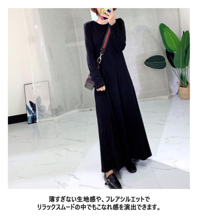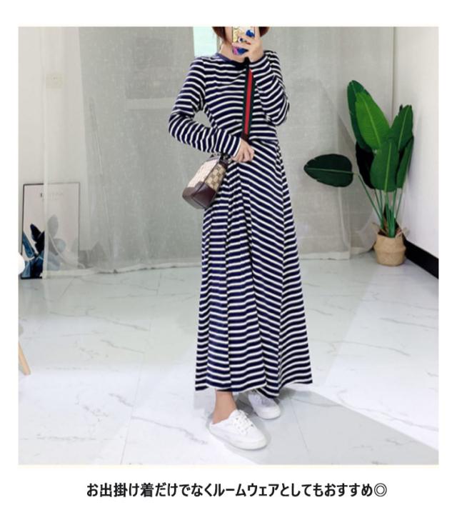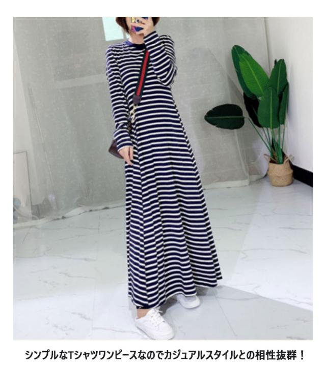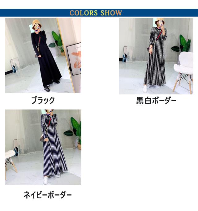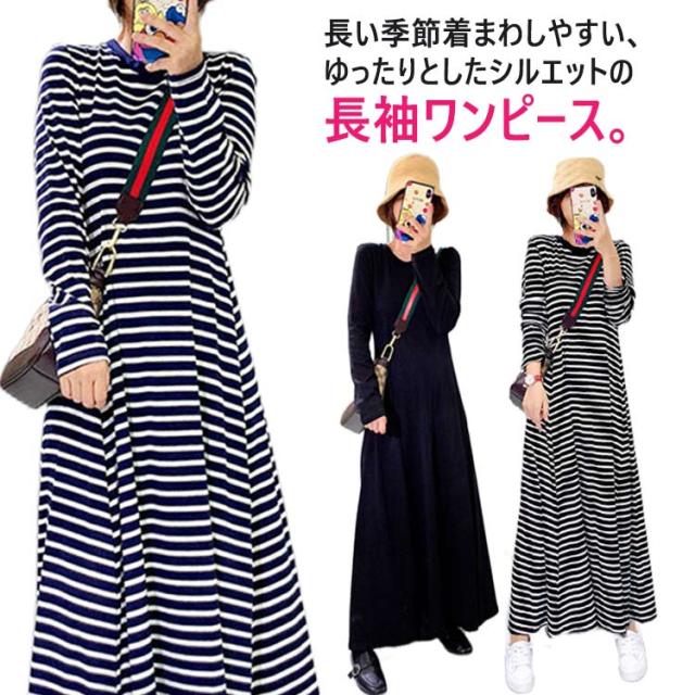 ボーダーワンピース tシャツ ワンピース レディース ロング 長袖 ロングワンピース カットソー フレアワンピース ボーダー柄 ロングワンピース 無地 大きいサイズ 大きめ カジュアル ブラック ネイビー