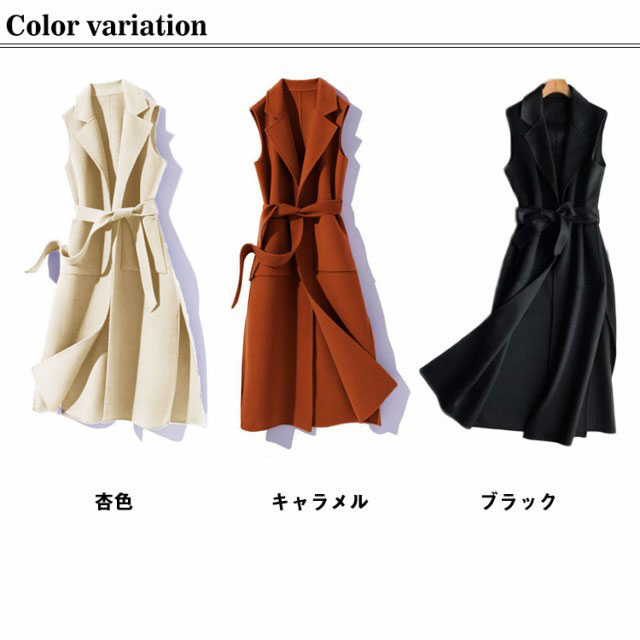 S−3XLサイズ!ノースリーブ チェスターコート メルトンコート ロングベスト レディース アウター コート ベルト付き 秋服 春服 キレイめ 通勤 上品 30代 40代 50代 杏色 ブラック キャラメル 送料無料