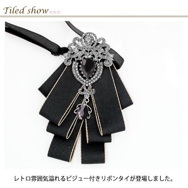 | いつものスタイルを新鮮な印象に変えてくれるリボンタイ。 レトロ雰囲気溢れるビジュー付きリボンタイが登場しました。 シャツやワンピース、ニットなど色々なアイテムと合わせやすく、メリハリのある上品スタイル完成。 制服用はもちろん、卒業式、入学式、ダンス、結婚式の余興、コスプレ、スクールバッグにつけてもOK! | |