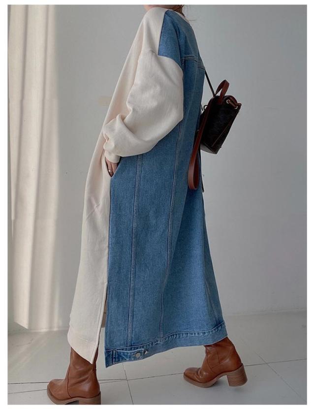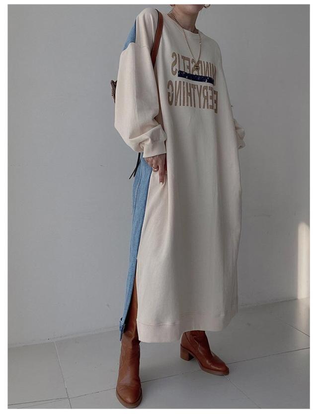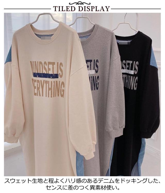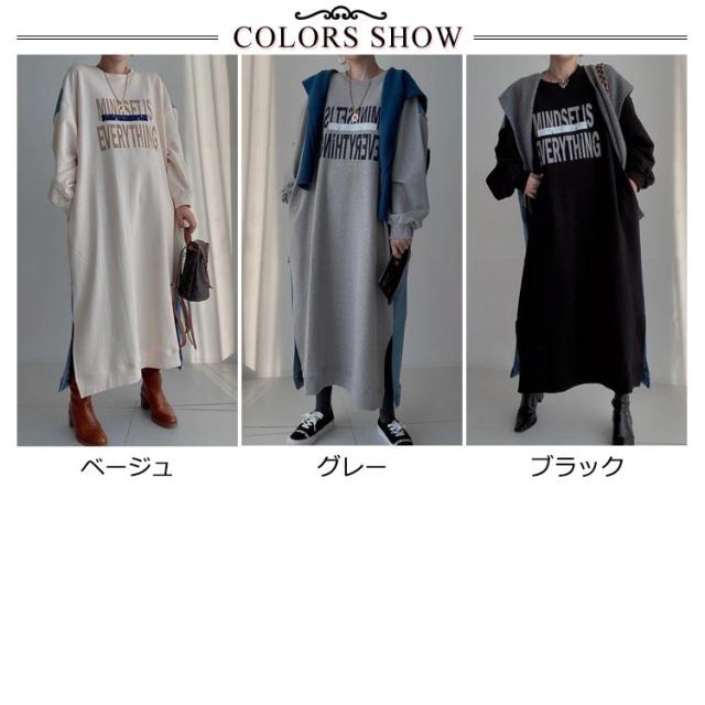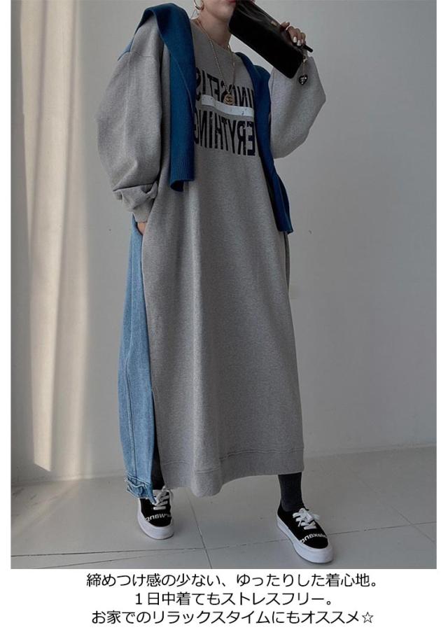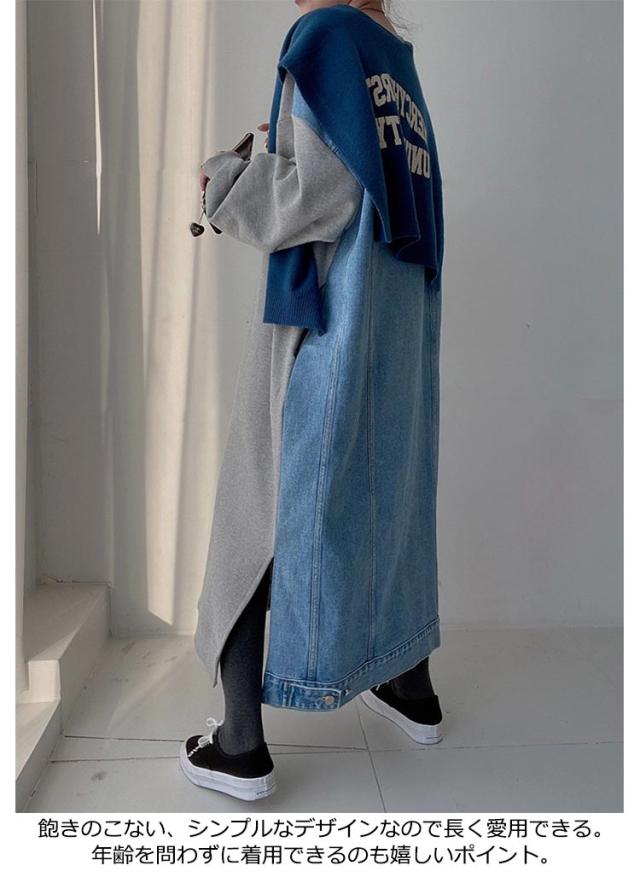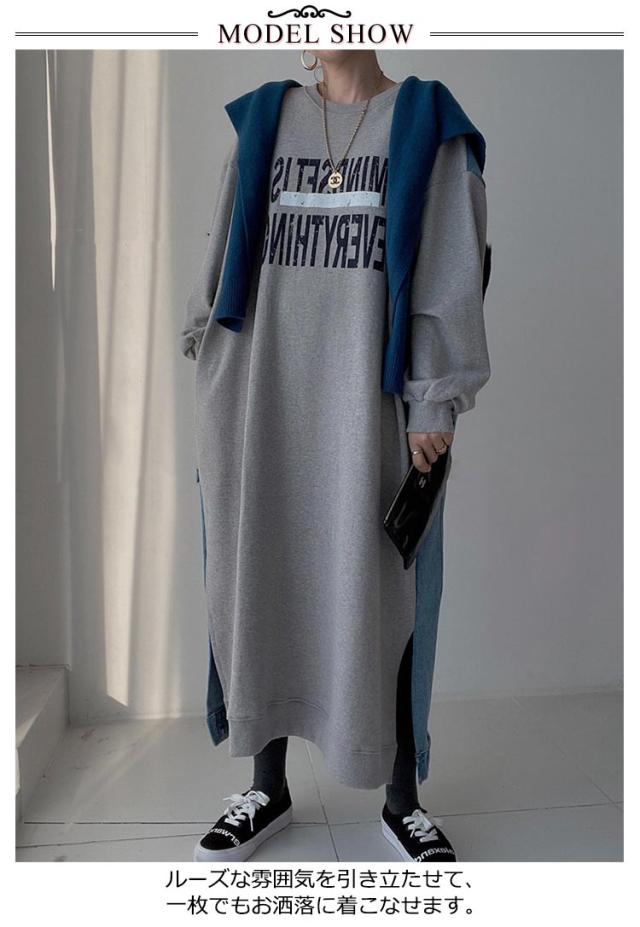 マキシ丈 スウェットワンピース ロングトレーナー デニム レディース 送料無料 デニムワンピース 春 スウェット 長袖ワンピース ドロップショルダー クルーネック 春 秋 オーバーサイズ マキシワンピース ゆったり 体型カバー カジュアル トレーナー 長袖