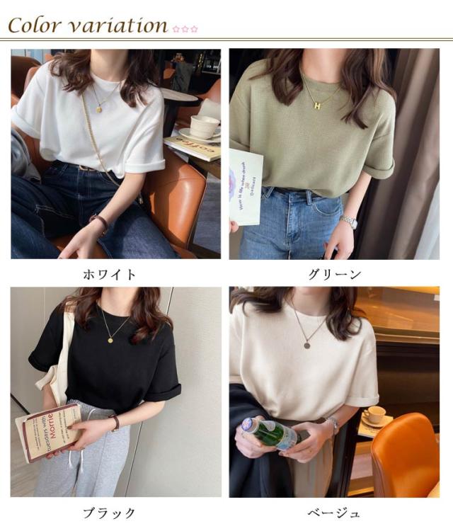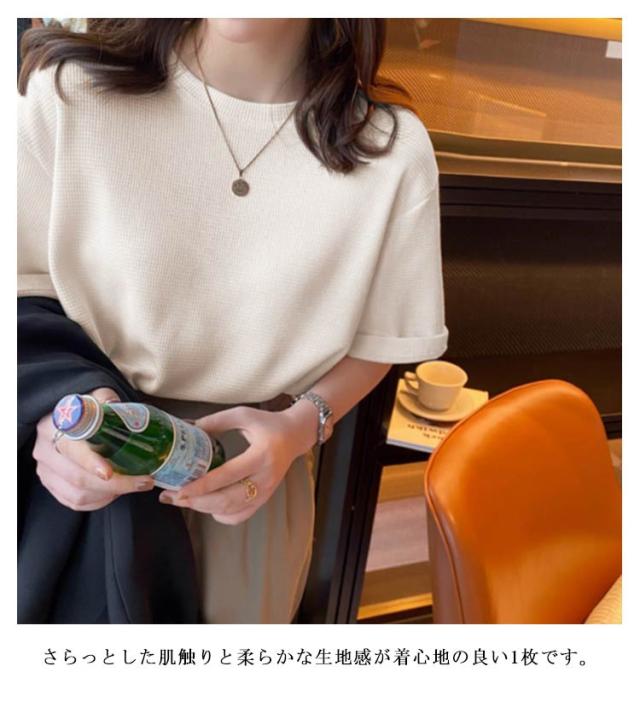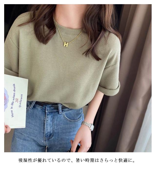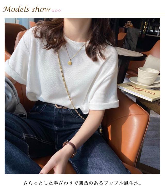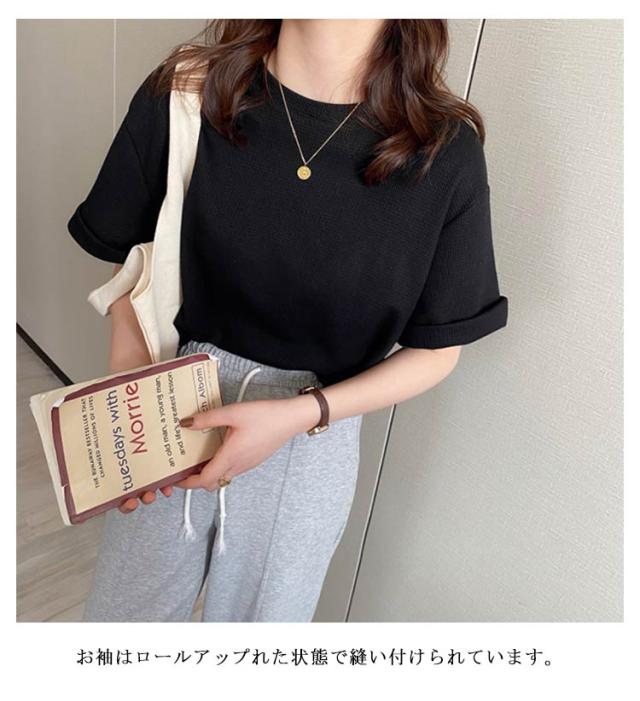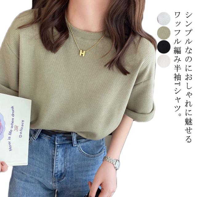 トップス ロールアップ 丸首 レディース プルオーバー Tシャツ 秋 春 夏 クルーネック 半袖 ワッフル編み 無地 カットソー サーマル シンプル カジュアル 白 大きいサイズ 柔らかい 楽ちん ゆったり お洒落 着回し ワッフル 黒 ホワイト グリーン ブラック ワッフル