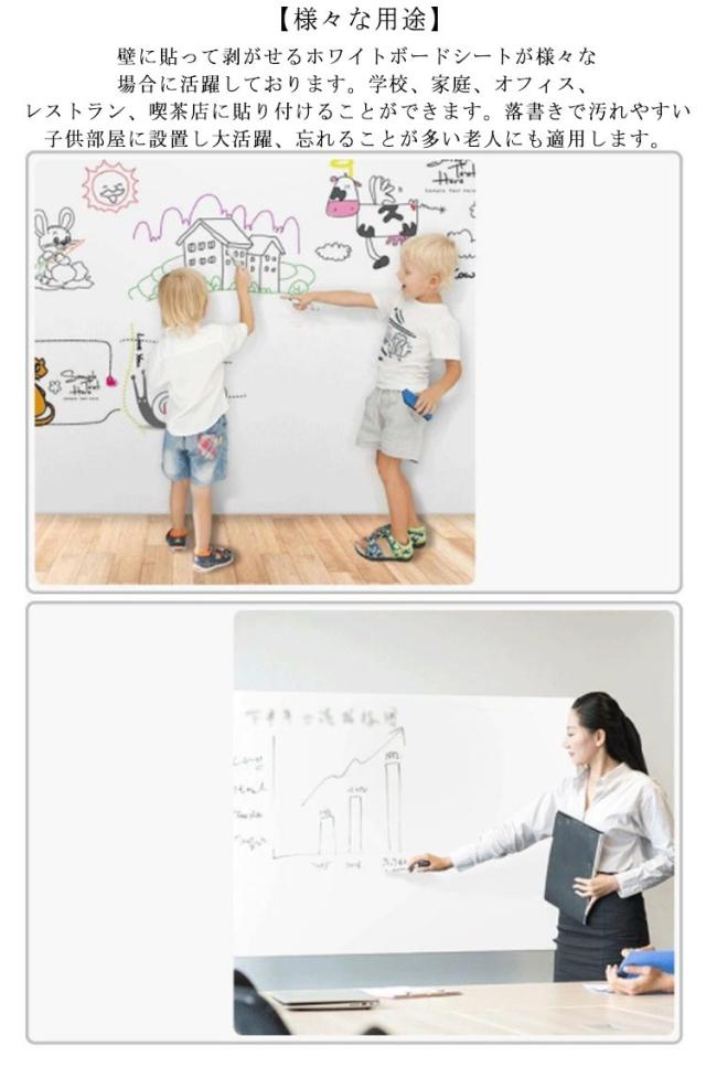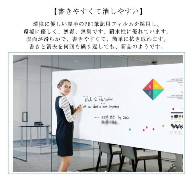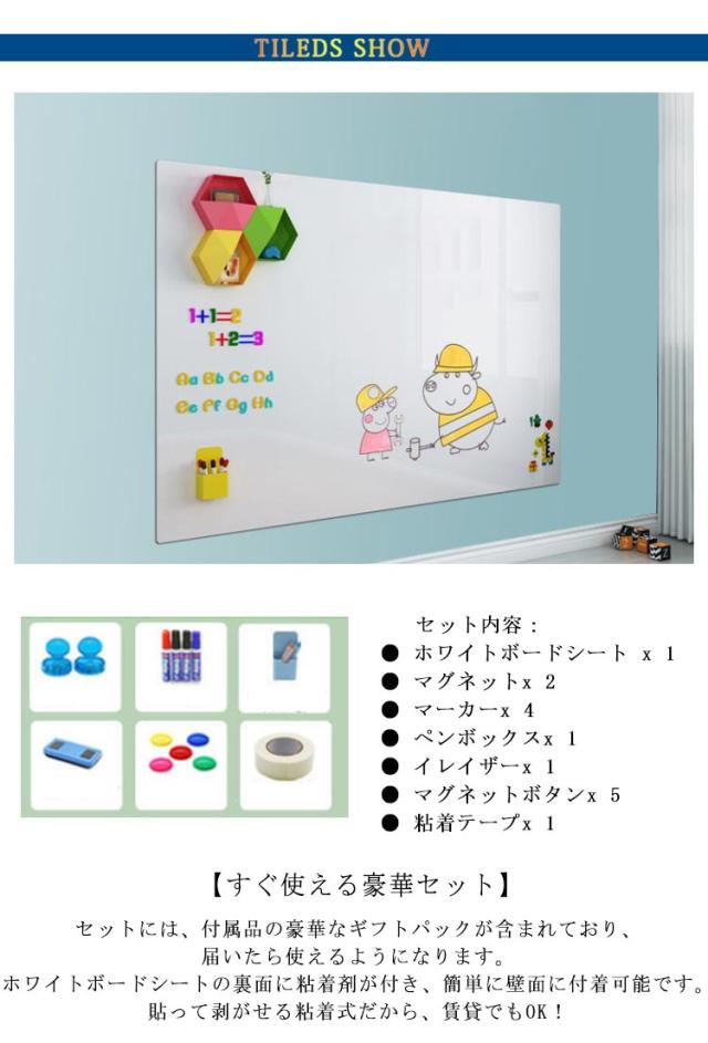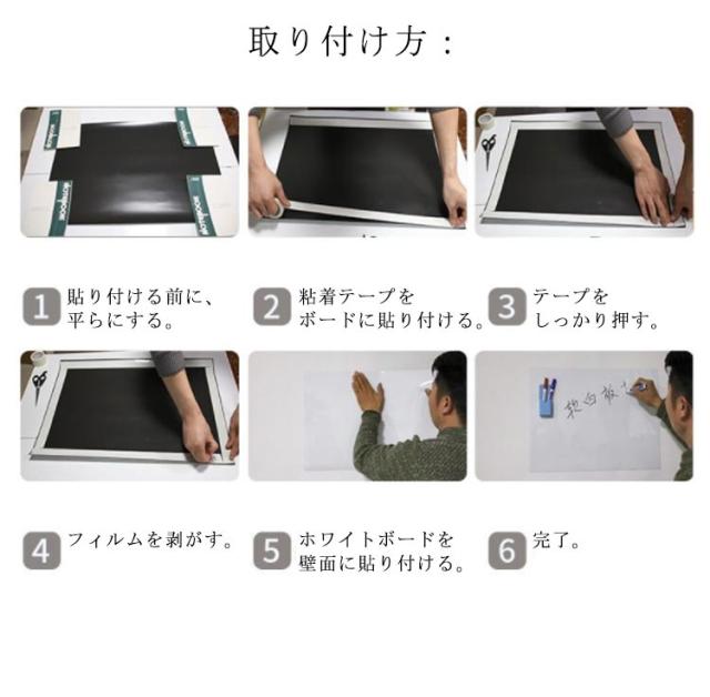 | 【7点セット】【60*150cm】【マグネット対応】 セット内容: ● ホワイトボードシート x 1 ● マグネットx 2 ● マーカーx 4 ● ペンボックスx 1 ● イレイザーx 1 ● マグネットボタンx 5 ● 粘着テープx 1 【自由に切れる】 本商品が大判のホワイトボードシートですが、柔軟な素材を採用するので、曲げたり、巻けたり、DIYカットしたりすることができます。 【マグネット対応】 お商品の基材層中では高分子鉄粉を豊富に含んでいて、磁性が強くて、磁石でプリント用紙、事務所の予定表、ポスター、写真などをホワイトボードシートに簡単に引き付けられます。※ 注意:磁気と書く機能を守るため、ご使用前に保護フィルムを剥がしてください。 【書きやすくて消しやすい】 環境に優しい厚手のPET筆記用フィルムを採用し、環境に優しく、無毒、無臭です、耐水性に優れています。表面が滑らかで、書きやすくて、簡単に拭き取れます。書きと消去を何回も繰り返しても、新品のようです。 【すぐ使える豪華セット】 セットには、付属品の豪華なギフトパックが含まれており、届いたら使えるようになります。 ホワイトボードシートの裏面に粘着剤が付き、簡単に壁面に付着可能です。貼って剥がせる粘着式だから、賃貸でもOK! 【様々な用途】 壁に貼って剥がせるホワイトボードシートが様々な場合に活躍しております。学校、家庭、オフィス、レストラン、喫茶店に貼り付けることができます。落書きで汚れやすい子供部屋に設置し大活躍、忘れることが多い老人にも適用します。 取り付け方: 貼り付ける前に、平らにする。 粘着テープをボードに貼り付ける。 テープをしっかり押す。 フィルムを剥がす。 ホワイトボードを壁面に貼り付ける。 完了。 | |