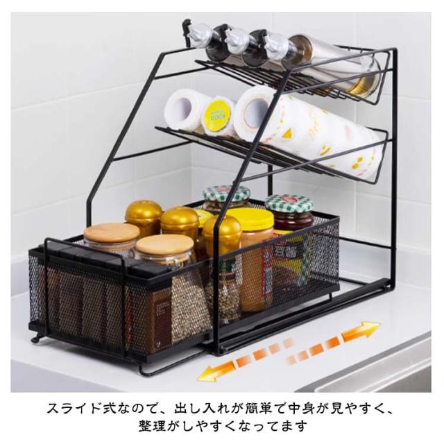 | 【シンク下収納】【引き出し式】【3段/2段】 シンク下や台所周りの散らかった小物を綺麗に整理! スライド式なので、出し入れが簡単で中身が見やすく、整理がしやすくなってます シンク下はもちろん、洗面台の下や、キッチンの上や部屋など色んな場所で大活躍。 スペースを活用してキッチン小物を整理整頓できます。 シンクの下を使いやすく、無駄なく収納できます。 | |