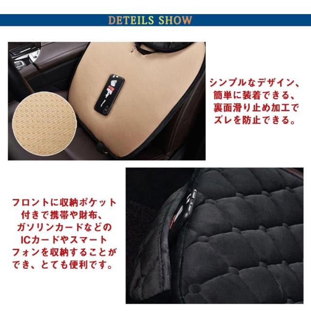 | 車用シートカバー 3枚セット。 シンプルなデザイン、簡単に装着できる、裏面滑り止め加工でズレを防止できる。 フロントに収納ポケット付きで携帯や財布、ガソリンカードなどのICカードやスマートフォンを収納することができ、とても便利です。 シートベルト受け具部分の空間を空けて設置してください。 シートの隙間に挿し込むだけ。 簡単に装着できとっても便利です。 | |