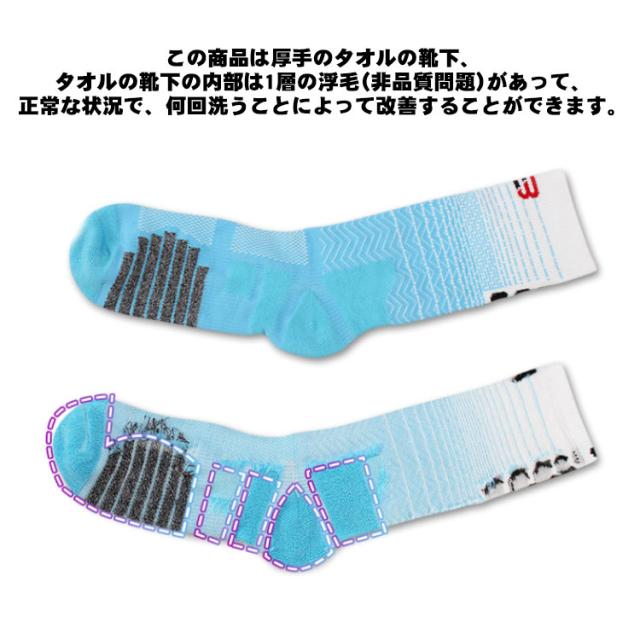 | 快適性と機能性を兼ね備えたスポーツを楽しむ為の靴下です。 優れたフィット感で足の負担や疲労を軽減してくれます。 靴下を厚く設計して、普通の厚さの靴下より汗を吸って、通気性の滑り止め、衝撃を減らして、快適性が良い 足の甲部分は薄いメッシュの速乾通気性の生地で足を早く湿らせ、空気を通すことができていつも快適。 つま先部分からかかと部分まで厚めの生地で衝撃を吸収で角の丸いデザインが滑りも防ぐ。 この商品は厚手のタオルの靴下、タオルの靴下の内部は1層の浮毛(非品質問題)があって、 正常な状況で、何回洗うことによって改善することができます。 | |