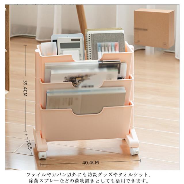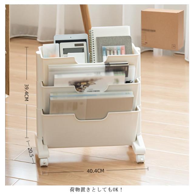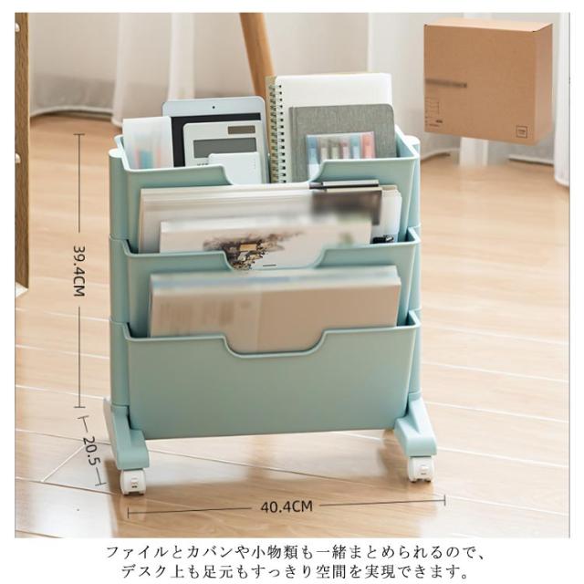 | 細かな仕切りで、たっぷりの書類やファイル、封書などを整頓できる収納ワゴン。 仕切り付きで仕分けができる取り出しやすい仕様。 3段でデスク下用収納にも最適。オフィスや家庭向けの、本棚・ファイル収納に。 デスク周りに置いておきたい参考書籍を収納し、デスクで作業をしながら使いたいときに便利です。 荷物置きとしてもOK! ファイルやカバン以外にも防災グッズやタオルケット、除菌スプレーなどの荷物置きとしても活用できます。 ファイルとカバンや小物類も一緒まとめられるので、デスク上も足元もすっきり空間を実現できます。 移動に便利なキャスター付きなので、掃除や物を取り出す際にも楽に動かすことができます。 | |