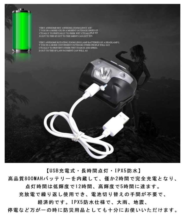 | 【高輝度LEDライト・照射角度調整可】明るさは300ルーメン、照射距離最大約150メートル。ヘッドライトの先端は照射角度(60度まで)調整ができますので、足元だけではなく、照射周囲を広く照らし、危険がよく避けられます。 【USB充電式・長時間点灯・IPX5防水】高品質800mAHバッテリーを内蔵して、僅か2時間で完全充電となり、点灯時間は低輝度で12時間、高輝度で5時間に達ます。充放電で繰り返し使用でき、電池切り替えの手間が不要で、経済的です。IPX5防水仕様で、大雨、地震、停電など万が一の時に防災用品としても十分にお使いいただけます。 【3種の点灯モードとセンサー検知機能】3種の点灯モードを提供:ホワイトビームの高・中・低;緊急用のSOS点滅。センサー機能も搭載され、LEDヘッドライトが手の動き(10CM以内)を感知して自動的に点灯/消灯します。 【軽量&フィット感】:ヘッドライト本体の重さは約38gと非常に軽量です、サイズは3x3.3x6cmだけで。また、ソフトベルトを採用され、夜釣りなどの場合は長時間装着しても首にストレスを与えません。登山、釣り、キャンプ、ハイキングや自動車整備などでのアウトドア活動に活躍します。 | |