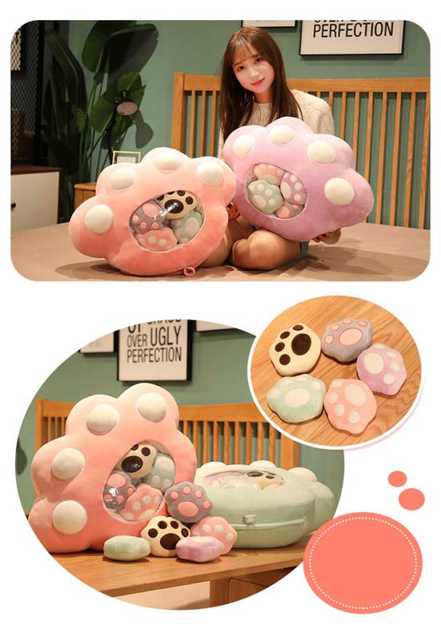 | 5つのミニ肉球のぬいぐるみがついてる!もちもち肉球のぬいぐるみ もちもち生地で弾力もあるのでクッションとしても心地よく使えます♪ かわいい見た目も癒しポイントです。 ファスナー留めだから中のミニぬいぐるみが取り出せます。 | |