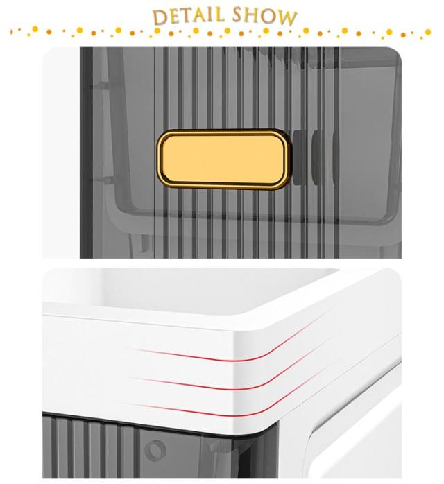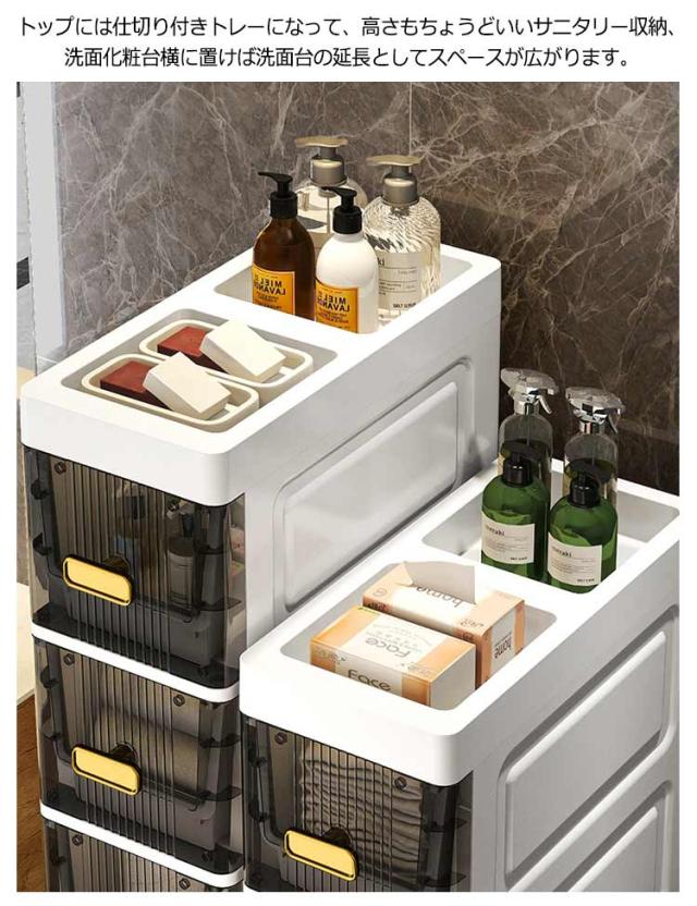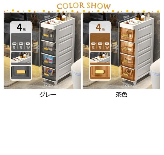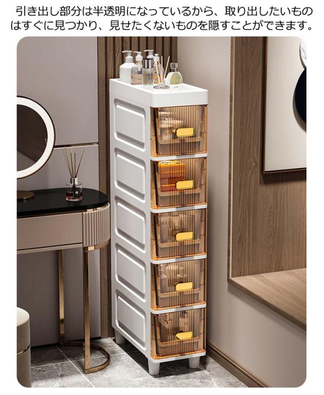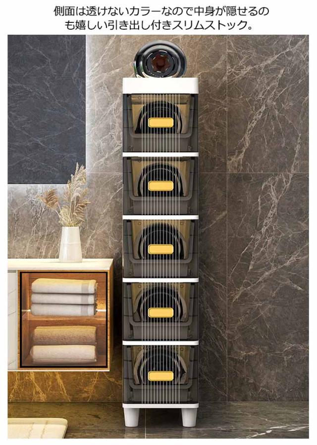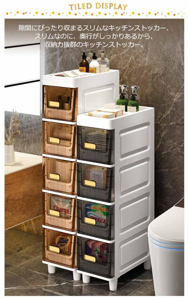 | すき間やデッドスペースを有効活用するスリムストッカー。 隙間にぴったり収まるスリムなキッチンストッカー、スリムなのに、奥行がしっかりあるから、収納力抜群のキッチンストッカー。 透明感のある引き出し&ゴールドメッキが施された取っ手、インテリアにもなるおしゃれな見た目、生活感を抑え、キッチン、リビング、浴室、トイレ、洗面所、ランドリー、子供部屋、玄関など場所を選びません。 側面は透けないカラーなので中身が隠せるのも嬉しい引き出し付きスリムストック。 抜け落ち防止ストッパー付き、最後まで引き出しても抜け落ちにくくなっています。小さなお子様のいるご家庭でも安心してお使いいただけます。 引き出し部分は半透明になっているから、取り出したいものはすぐに見つかり、見せたくないものを隠すことができます。 トップには仕切り付きトレーになって、高さもちょうどいいサニタリー収納、洗面化粧台横に置けば洗面台の延長としてスペースが広がります。 水やカビ・汚れに強いのでキッチンや洗面所などの水周りでの使用に最適のキッチンラックです。 | |