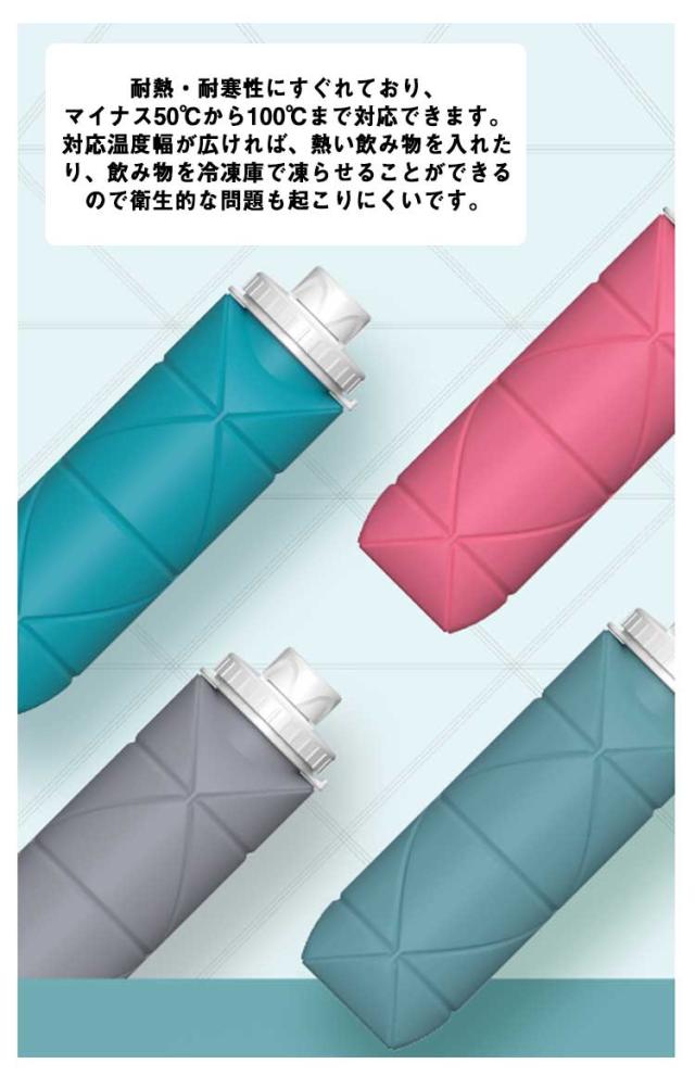 | カラーがかわいくてコンパクトに収納できる水筒「シリコンボトル」。 【無毒・健康で安全】 この折りたたみ式ウォーターボトルは、食品グレードのシリコンでできているため、無毒です。 無味または独特で、毎日使用できる実用的で安全な飲料ボトルを提供します。 【丈夫で頑丈】 折りたたみ式のウォーターボトルはやわらかいですが壊れにくいです。 耐熱・耐寒性にすぐれており、マイナス50℃から100℃まで対応できます。 対応温度幅が広ければ、熱い飲み物を入れたり、飲み物を冷凍庫で凍らせることができるので衛生的な問題も起こりにくいです。 【大容量・省スペース】 このフレキシブルウォーターボトルは600mlの液体を収納でき、重さはわずか約135g。 高さ25.4cmから6cmまで折りたたむことができます。 折りたたみ式で軽量なデザインにより、スペースを80%節約でき、 持ち運びが簡単で保管も簡単です。 子供、友人、恋人、そして家族への素晴らしい贈り物。 【漏れ防止・お手入れが簡単】 トラベルウォーターボトルは、漏れを防ぐためにシリコンシールリングを採用しています。 口が広いデザインなので、折りたたみ式のウォーターボトルの内側を簡単に掃除したり、氷とレモンを追加したりできます。 初めてご使用の際は、沸騰したお湯に20分ほど浸してお手入れをお勧めします。 【持ち運びが簡単・使い勝手】 持ち運びに便利、飛散防止、折りたたみ式の折りたたみ式シリコンウォーターボトルは、丈夫なハンドルが付いているので持ち運びに便利です。 付属の多機能ストラップがワインボトルを折りたたんだ状態に固定し、外出時に持ち運びに便利です。 旅行、ジム、自転車、ランニング、キャンプ、釣り、ハイキング、登山、ヨガ、ビーチ、アウトドアスポーツに最適です。 | |