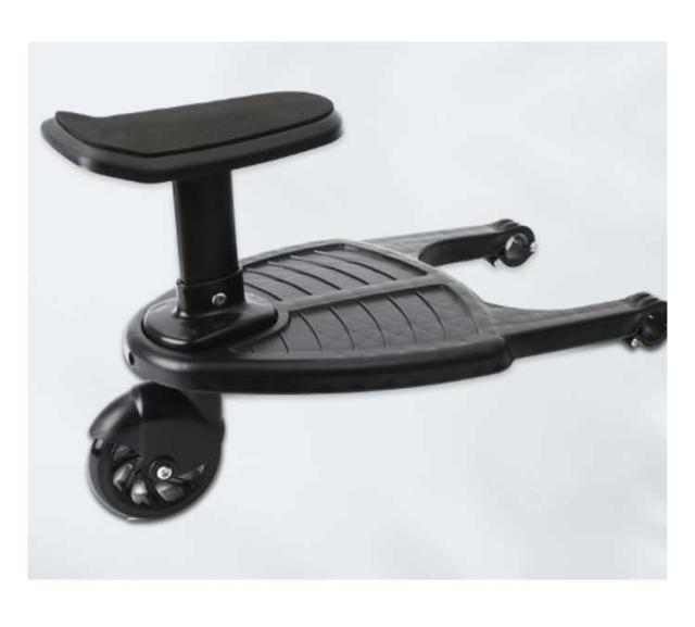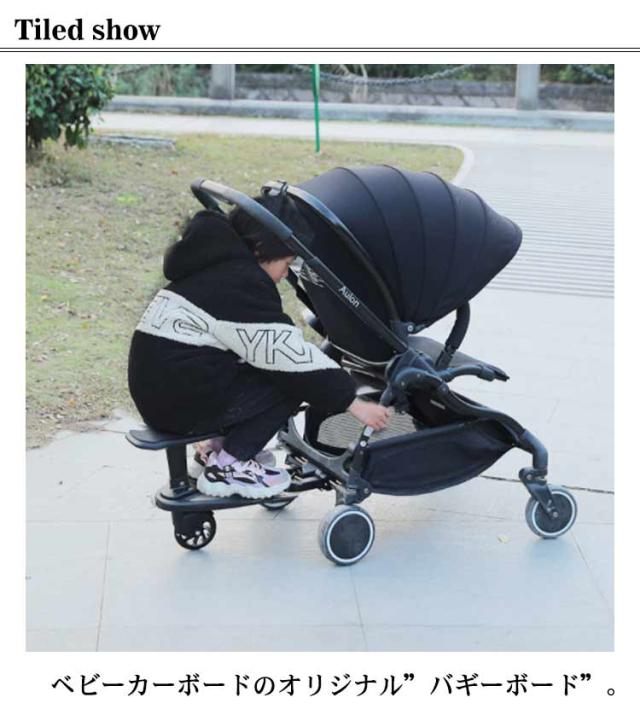 | お子さまを安全にサドルの上に座らせることができ、サドルを取り外してボードの上に立つこともできます。 ベビーカーボードのオリジナル”バギーボード”。下の子はベビーカーの座席に、上の子はボードの上と二人一緒に移動できます。 ベビーカー本体に取り付けるコネクターは工具不要、底部のバーを挟むだけの簡単取り付け。 使わないときは付属のベルトで吊り下げることで、ベビーカー走行の負担を減らせます。 | |
