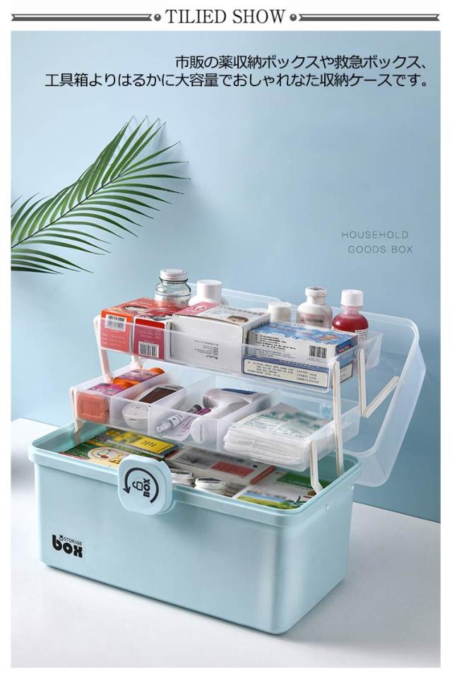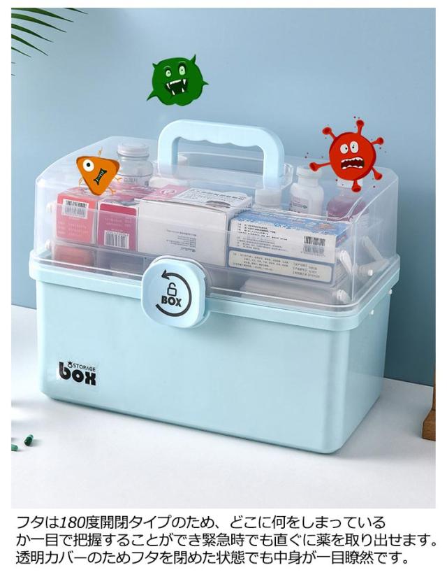 | 【大容量&コンパクトで収納便利】 【安心安全な造り】 【見やすく取り出しやすい】 【三段式家庭用薬箱は様々な需要にこたえます】 【多様な用途】 市販の薬収納ボックスや救急ボックス、工具箱よりはるかに大容量でおしゃれなた収納ケースです。 3段トレー付き工具箱のため沢山の物を綺麗に収納することが可能です。 コンパクトなため部屋のどこでも収納でき、持ち運びにも便利な大きさです。 開閉部分には「回転式安全ロック」を採用することでお子さんが不用意に開けて薬を飲みこんでしまうことを防ぎます。また、持ち上げる際にフタが開いて中身が全て落ちることを防ぎます。 フタは180度開閉タイプのため、どこに何をしまっているか一目で把握することができ緊急時でも直ぐに薬を取り出せます。 透明カバーのためフタを閉めた状態でも中身が一目瞭然です。 サイズLのは家庭での使用に最適です。部屋が狭い場合・収納する物が少ない場合・持ち運ぶことが多い場合は、サイズMに最適です。ご購入前に確認することをお薦めします。 薬箱以外にも、工具入れ、文具入れ、メイク道具入れ、おもちゃ箱、ソーイングボックス、ベイブレード ケース、釣具 収納、車載ボックス、ピットボックス、その他の様々な用途で活躍しています! | |