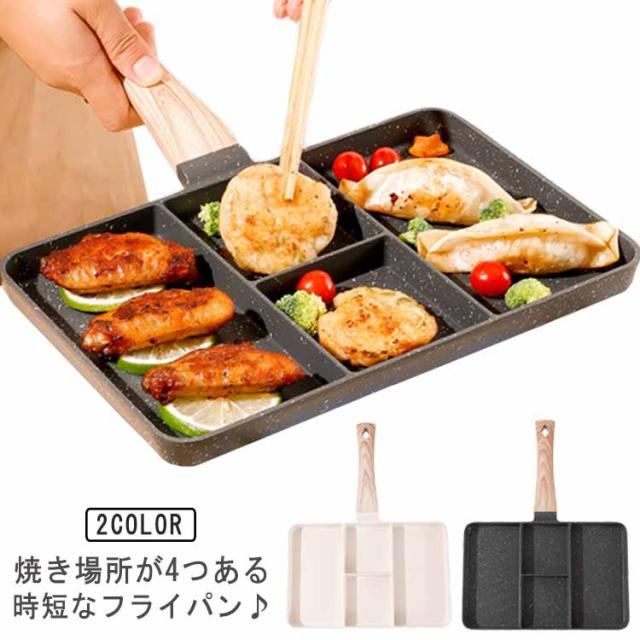 | 焼き場所が4つある時短なフライパン♪ 忙しい朝もこのフライパンを使えば、1度に卵焼きやウィンナー、ハンバーグなどの4つの食材を同時に調理することができます。洗う手間も1回で済みます。 IH・ガス火使用可能! 表面はフッ素樹脂加工を施してありますので、使用後のお手入れもラクラク。 時短もでき、省エネで経済的な仕切り付きフライパンです。 | |